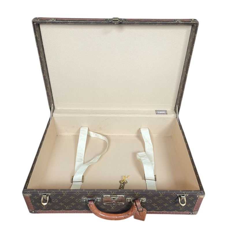 Prächtiger Louis Vuitton-Koffer aus der Mitte des Jahrhunderts, um 1950-1960 Dieser Koffer ist in einem für sein Alter unglaublichen Zustand, weit überdurchschnittlich im Vergleich zu den meisten anderen erhaltenen Exemplaren. Die Leinwand ist perfekt, ohne Flecken, das Innere ist sehr sauber, ohne Flecken und die Seriennummer noch angebracht. Der Originalanhänger und die Originalschlüssel sind vorhanden. Die Abmessungen sind 60x17,5x42,5 cm Insgesamt ein hervorragendes Beispiel für die Verwendung oder Dekoration. Inv: G2585