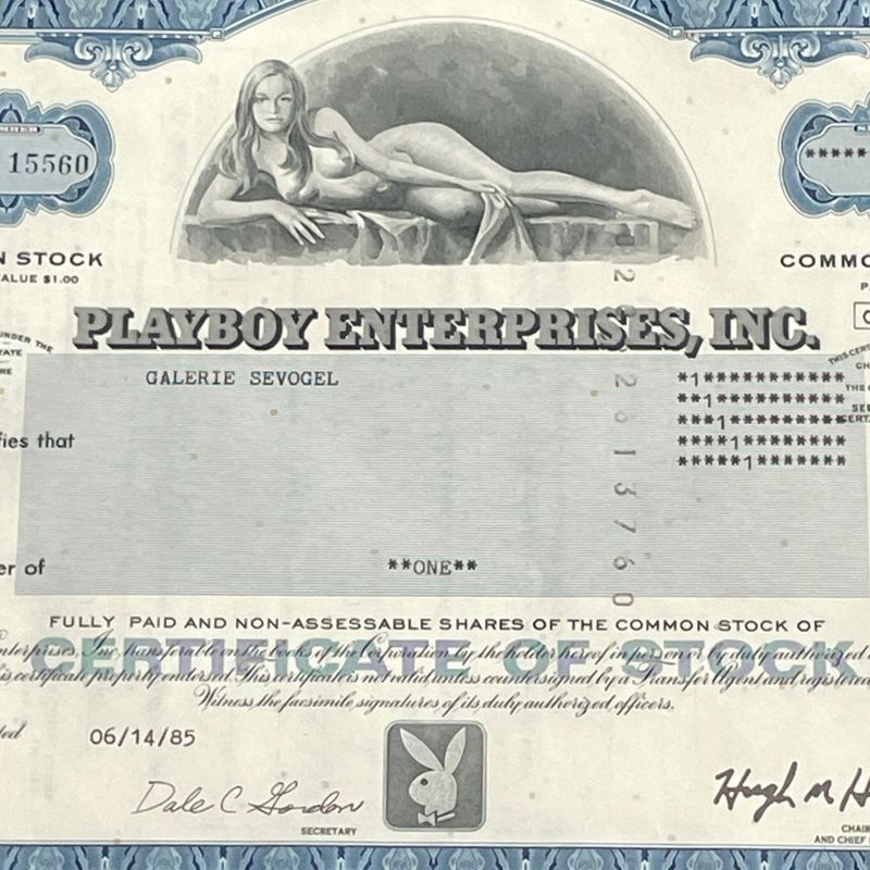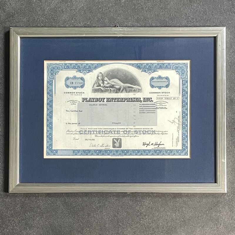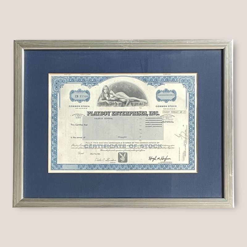 Schöne gerahmte Playboy Stammaktie von 1985 in ausgezeichnetem Zustand. Seltenes und sehr sammelwürdiges Stück Americana. 33,7x43,8 cm gerahmt Inv: G2597