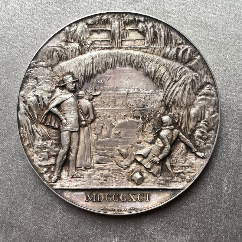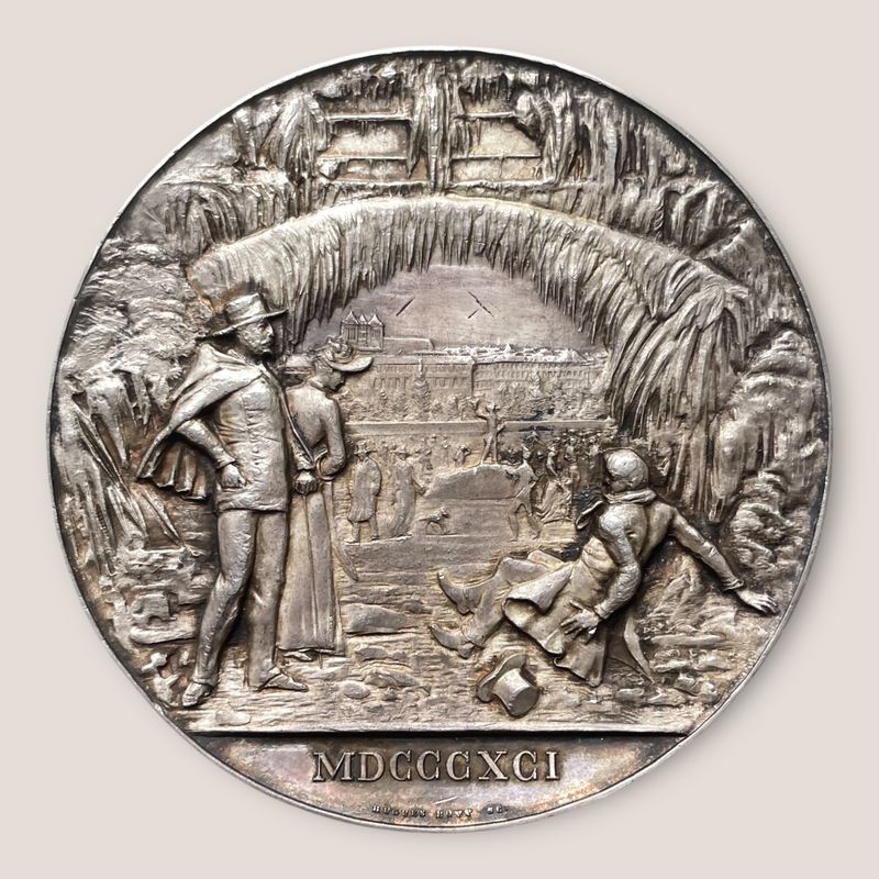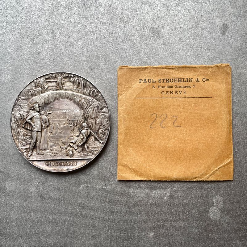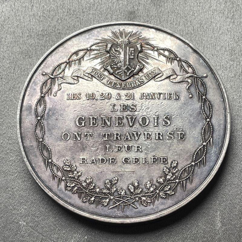 Silbermedaille von Hugues Bovy, herausgegeben anlässlich des Einfrierens des Genfer Hafens im Jahr 1891. Ansicht des zugefrorenen Hafens durch den Goléran des Eaux-Vives-Stegs. Datum und Name des Graveurs im Exergue / Sechszeilige Inschrift innerhalb eines Kreises aus gefrorenen Seilen. Wappen und Motto darüber. Glatter Rand. Durchmesser 71,0 mm; 163,56 g. Wund. 3129; Martin 65. Sehr selten. Die Ausgabe dieser Medaille war das Ergebnis einer privaten Initiative. Es wurden nur 10 Exemplare in Silber geprägt. Die vollständige Vereisung des Hafens war seit 1854 nicht mehr beobachtet worden. Verkauft von Paul Stroehlin, im Original-Papieretui. G25165
