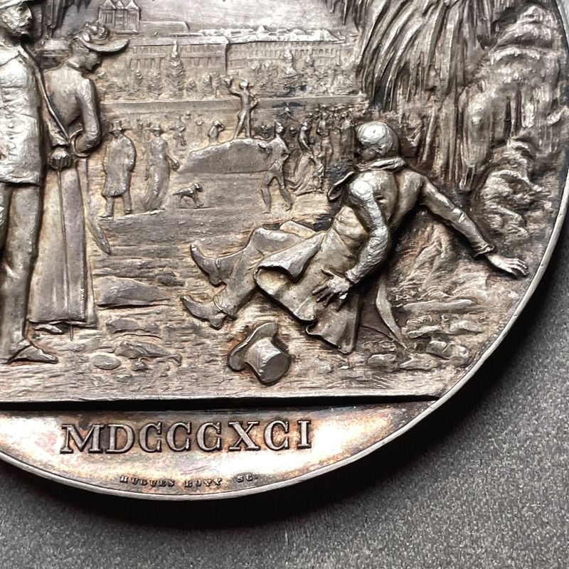 Silbermedaille von Hugues Bovy, herausgegeben anlässlich des Einfrierens des Genfer Hafens im Jahr 1891.