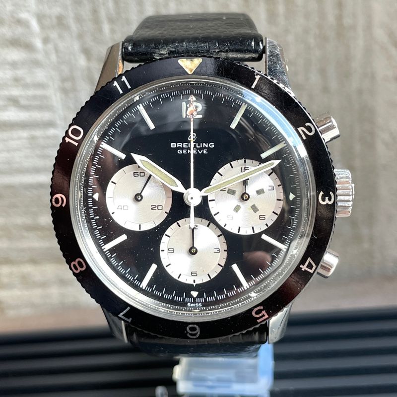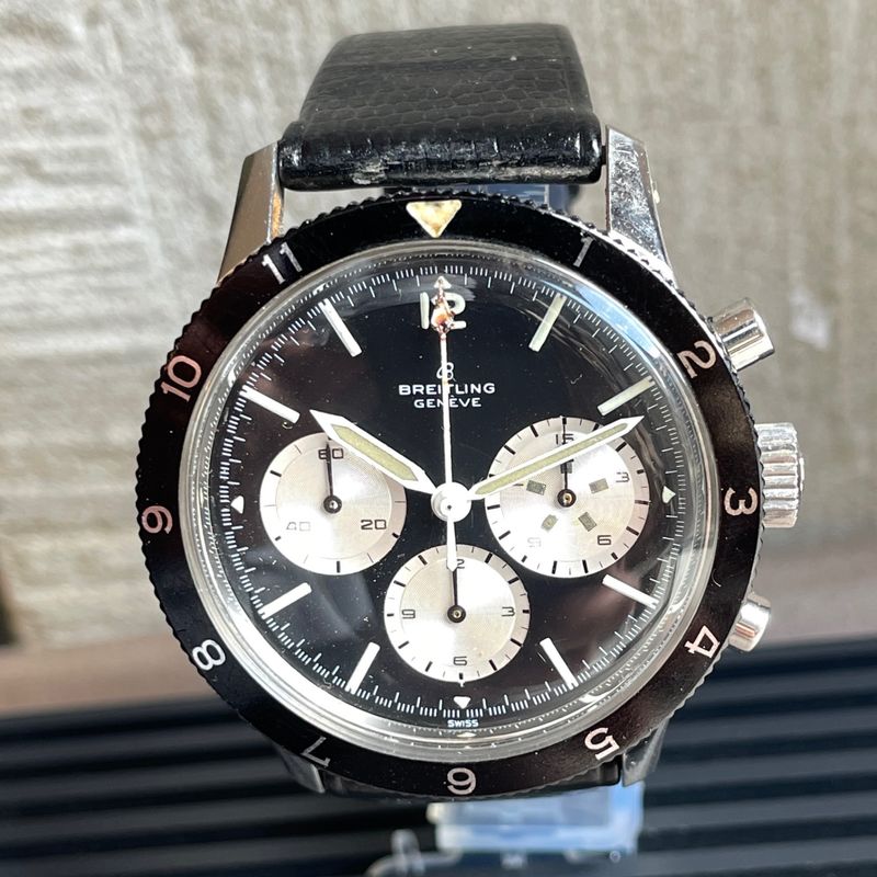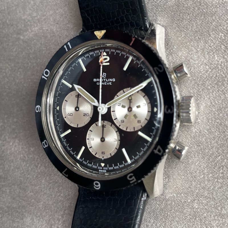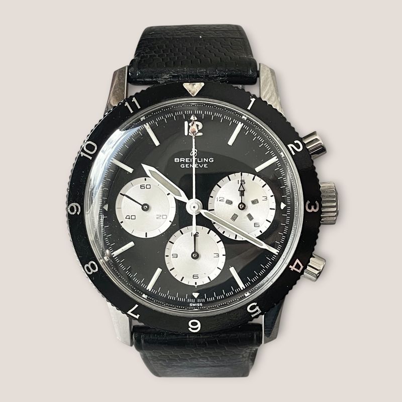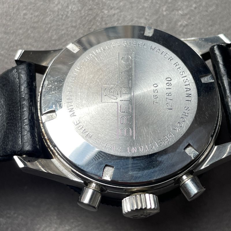 Seltener Breitling Ref. 7650 Raquel Welch 3-Zähler-Chronograph in Edelstahl, ausgestattet mit dem Kaliber Venus 178, mit Stunden- und Minutenadditionsfunktionen (30 min), Chronographenschaltung über ein Säulenrad, Handaufzugswerk.Originales Reverse-Panda-Zifferblatt, mit originalen Leuchtindexen und -zeigern. Unpoliertes 3-teiliges Gehäuse mit Druckboden, bidirektional drehbare Lünette mit 12-Stunden-Teilung.Abmessungen: 42,5 mm (ohne Krone und Drücker) × 48 mm (mit Bandanstößen) × 13 mm (mit Glas). Das Uhrwerk und das Gehäuse sind signiert und nummeriert. Uhr in ausgezeichnetem Zustand, würde von einer Reinigung profitieren. Inv: G26128