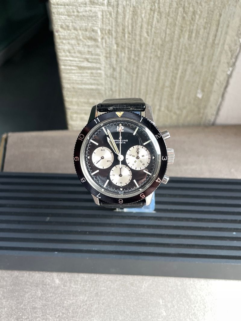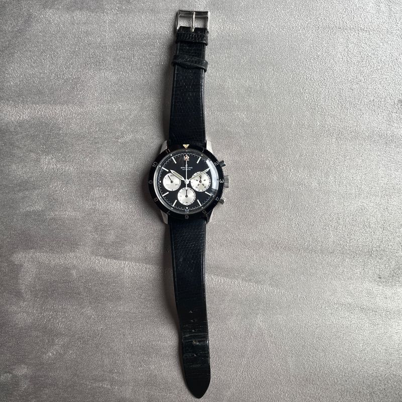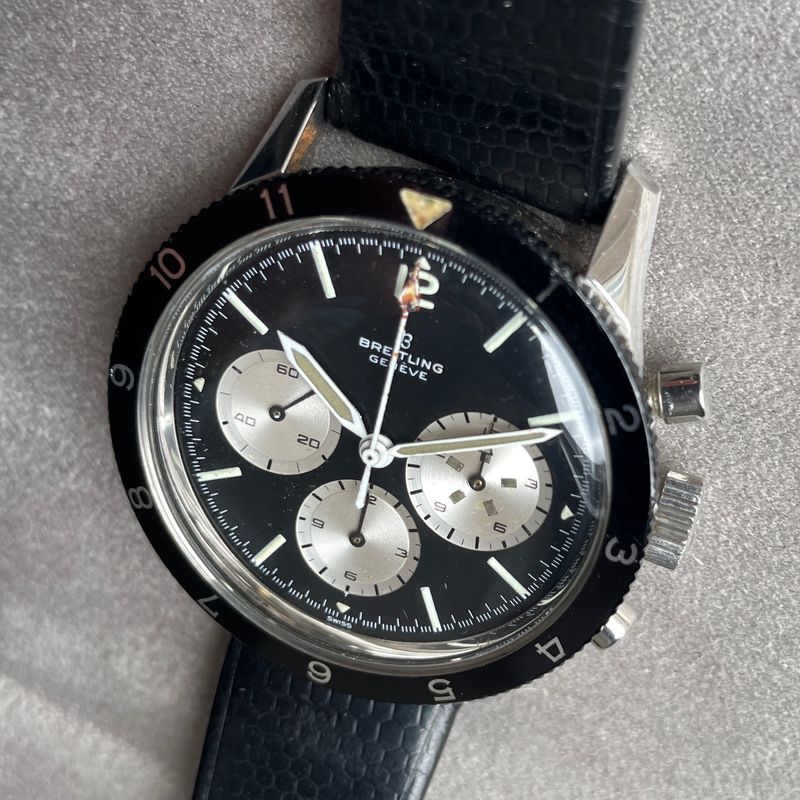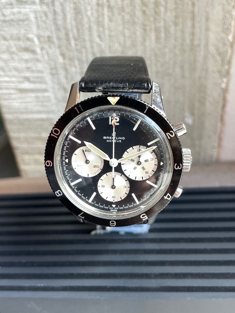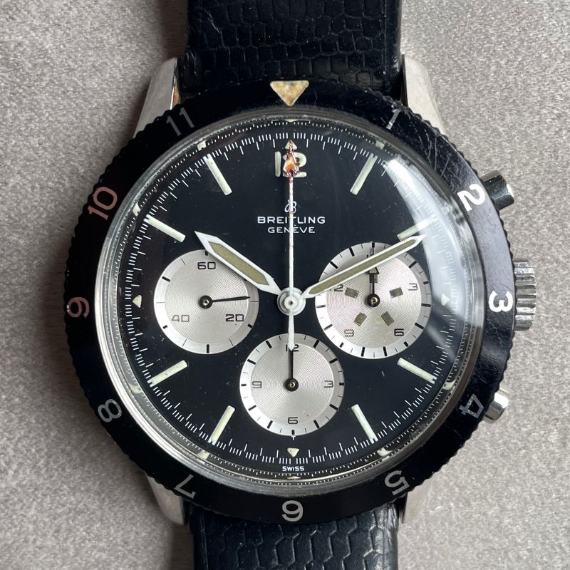 Seltener Breitling Ref. 7650 Raquel Welch 3-Zähler-Chronograph in Edelstahl, ausgestattet mit dem Kaliber Venus 178, mit Stunden- und Minutenadditionsfunktionen (30 min), Chronographenschaltung über ein Säulenrad, Handaufzugswerk.Originales Reverse-Panda-Zifferblatt, mit originalen Leuchtindexen und -zeigern. Unpoliertes 3-teiliges Gehäuse mit Druckboden, bidirektional drehbare Lünette mit 12-Stunden-Teilung.Abmessungen: 42,5 mm (ohne Krone und Drücker) × 48 mm (mit Bandanstößen) × 13 mm (mit Glas). Das Uhrwerk und das Gehäuse sind signiert und nummeriert. Uhr in ausgezeichnetem Zustand, würde von einer Reinigung profitieren. Inv: G26128