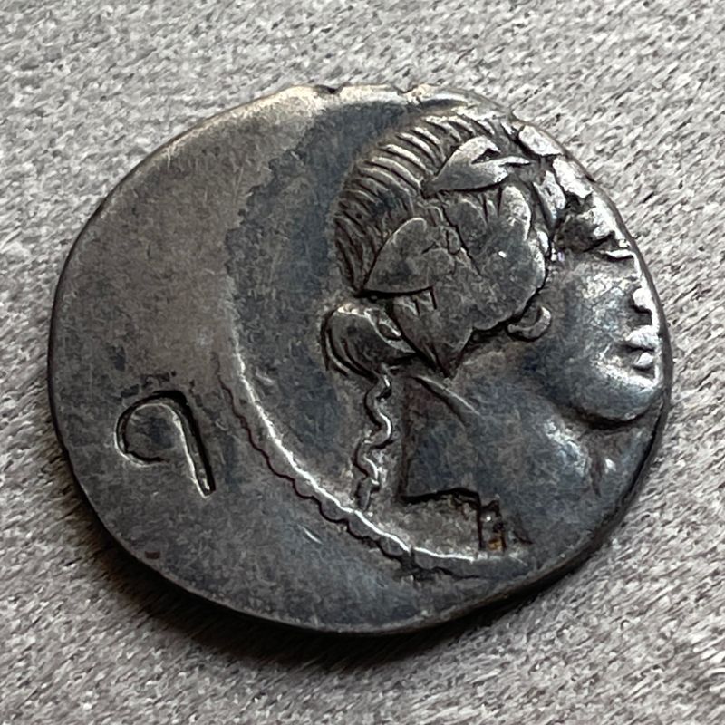 Römische Republik. C. Vibius Varus. Denier, Rom 42 v. Chr. JH. V. CHR. Kopf des Bacchus nach rechts / Panther springt zu einem Altar. 3,81g. Crawford 494/36; Syd. 1138. Schöne Patina aus einer Sammlung. Dezentrierte Vorderseite und Bankiersmarke. Inv: G26122