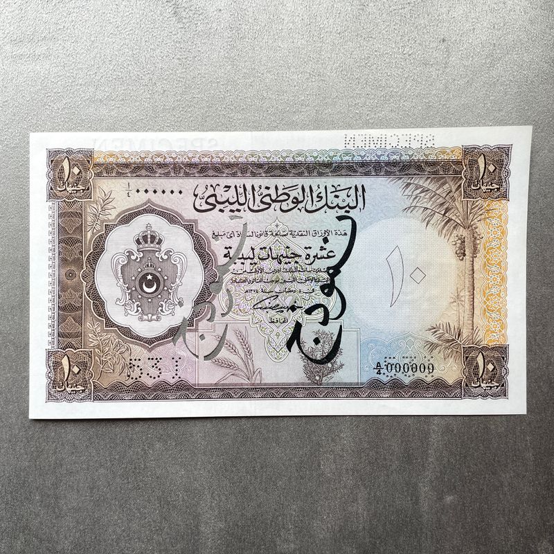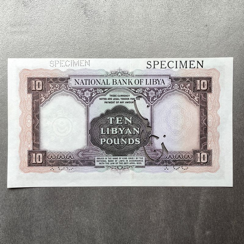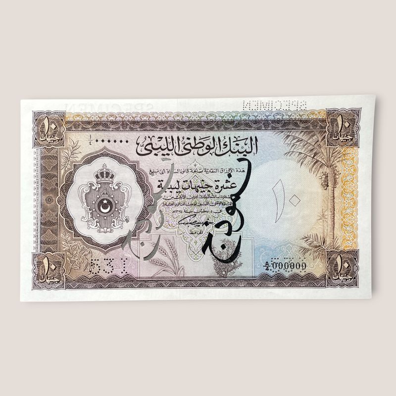 Libyen 10 Pfund 1955 Muster-Banknote. König Idris I.