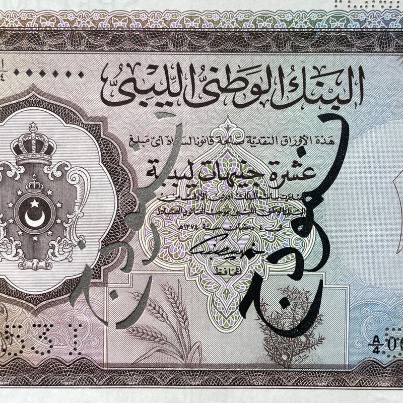 Libyen 10 Pfund 1955 Muster-Banknote. König Idris I. Sehr selten. Ungezirkelt. Überdruckt SPECIMEN in Arabisch in Schwarz und einmal in Englisch auf der Rückseite, gezähnt SPECIMEN in Arabisch und zweimal 531. Inv: G26140