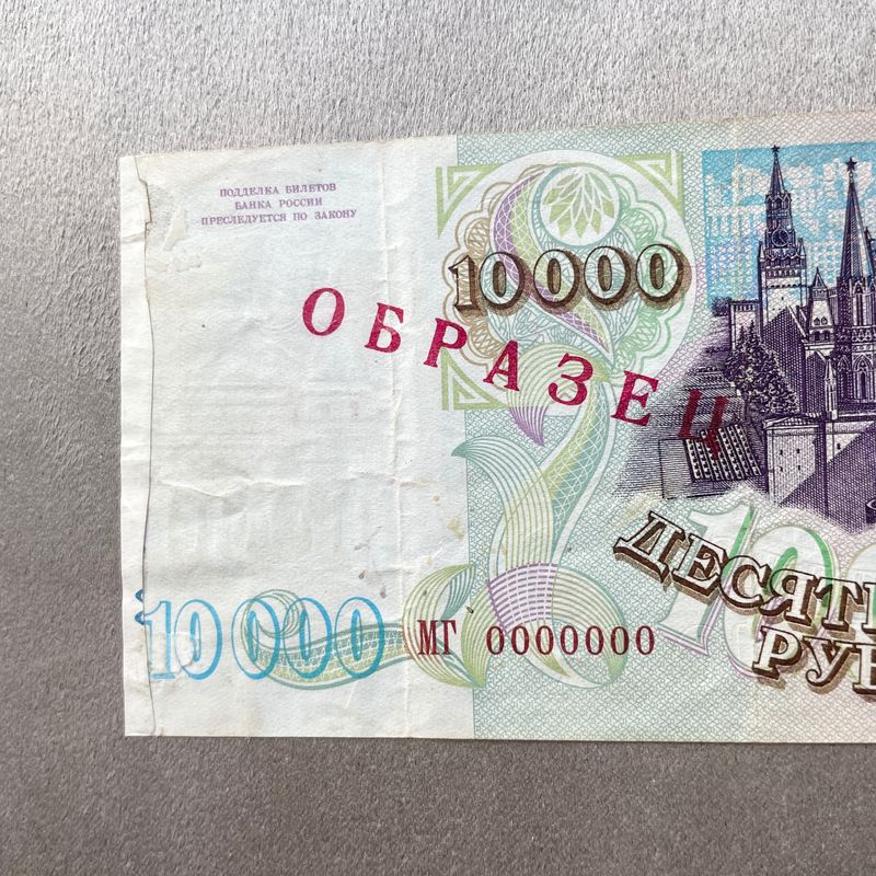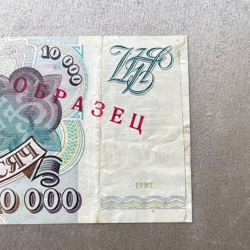 Russland, 10000 Rubel 1993 Specimen Banknote Sehr seltene, nicht referenzierte Serie für ein Exemplar. Beschädigt, fehlende Seite mit Restaurierung. Inv: G26143