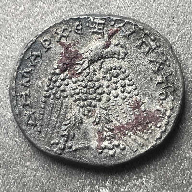 Tetradrachm, Antioch, 205-207. Laureate head of Caracalla to right / Eagle standing facing on thigh of sacrificial animal, head and tail right, with spread wings, holding wreath in beak.