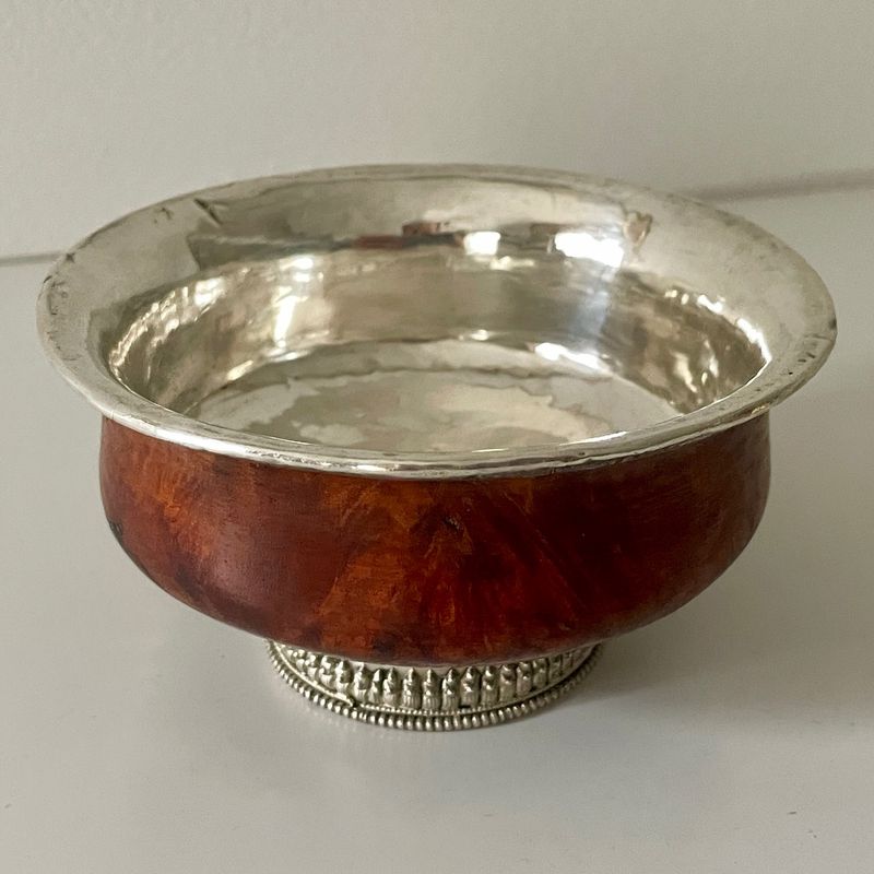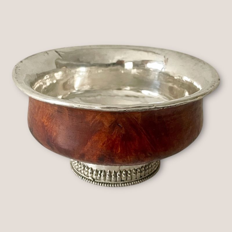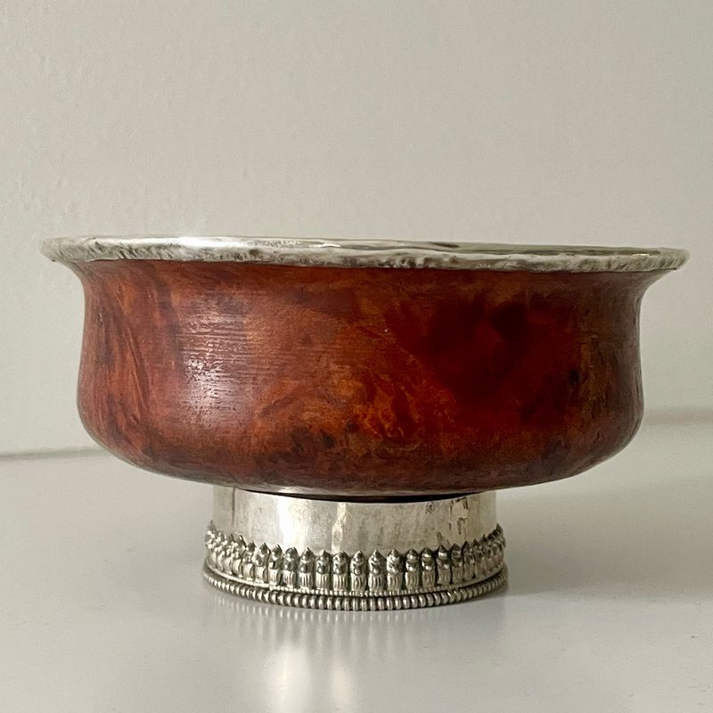 Tibetan footed Silver lined Burl timber ceremonial tea bowl.