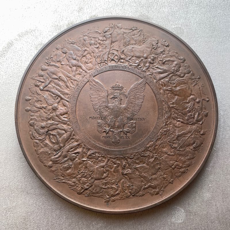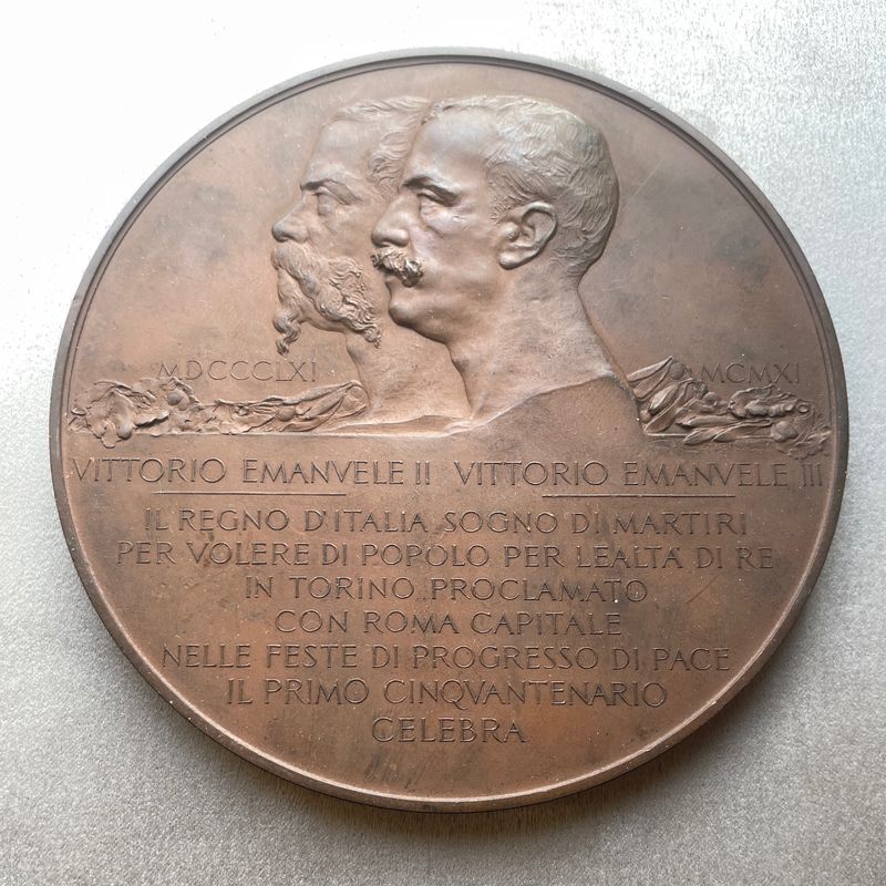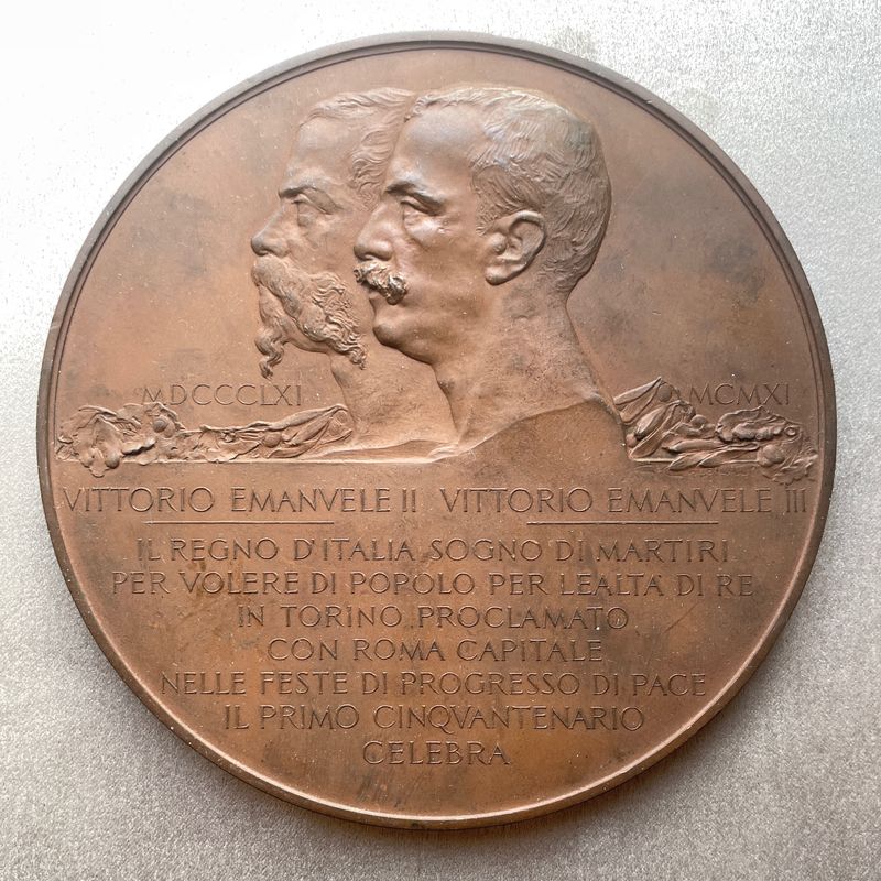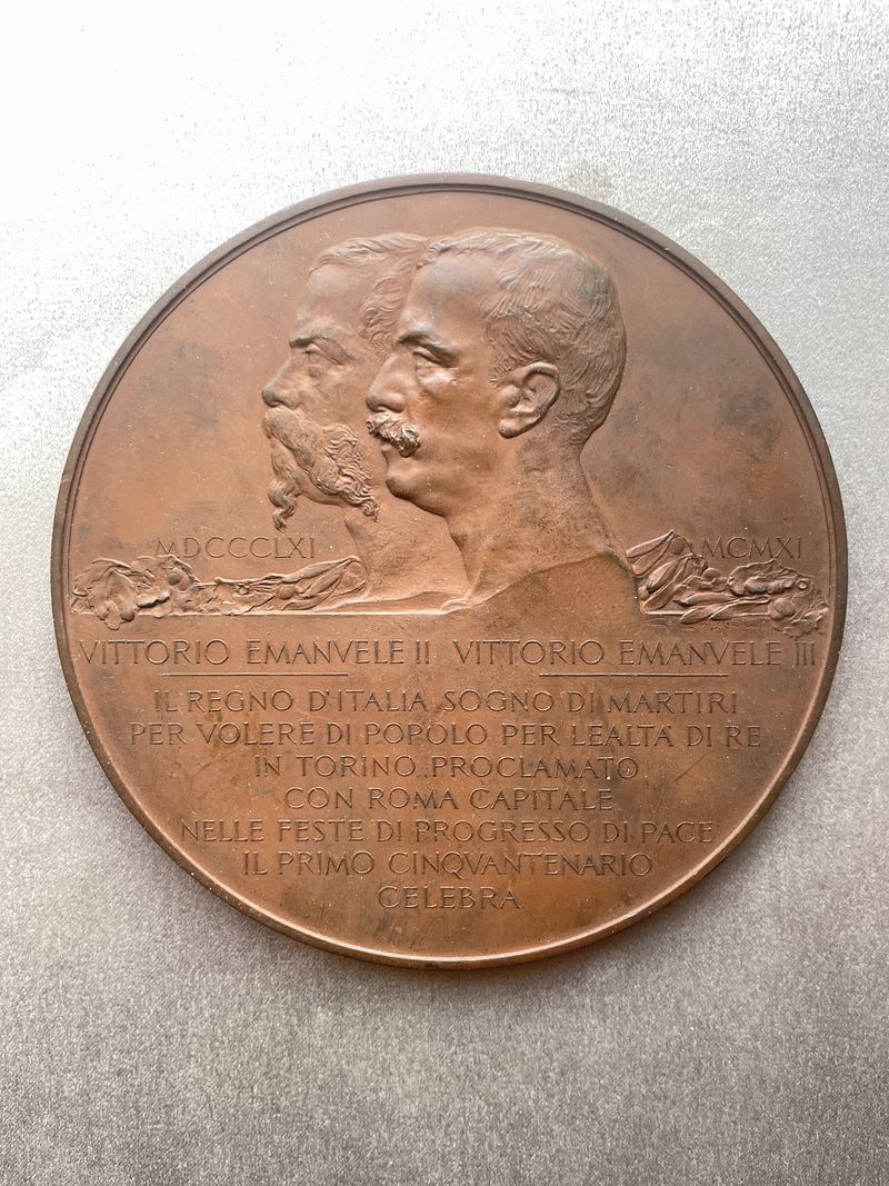 Italy, Kingdom of Italy, Victor Emmanuel III (1900–1946), fiftieth anniversary of the Kingdom of Italy, large bronze commemorative medal, 1911, by Giannino Castiglioni and Angelo Cappuccio for the Johnson firm in Milan, plain edges, diameter 12.06 cm, 749.2 g (red bronze). From the collection of Their Majesties Kings Victor Emmanuel III and Umberto II, originating from the personal collection of Her Royal Highness Princess Maria Gabriella of Savoy. Piguet (27 Nov 2025), lot 1064. Inv: G2658