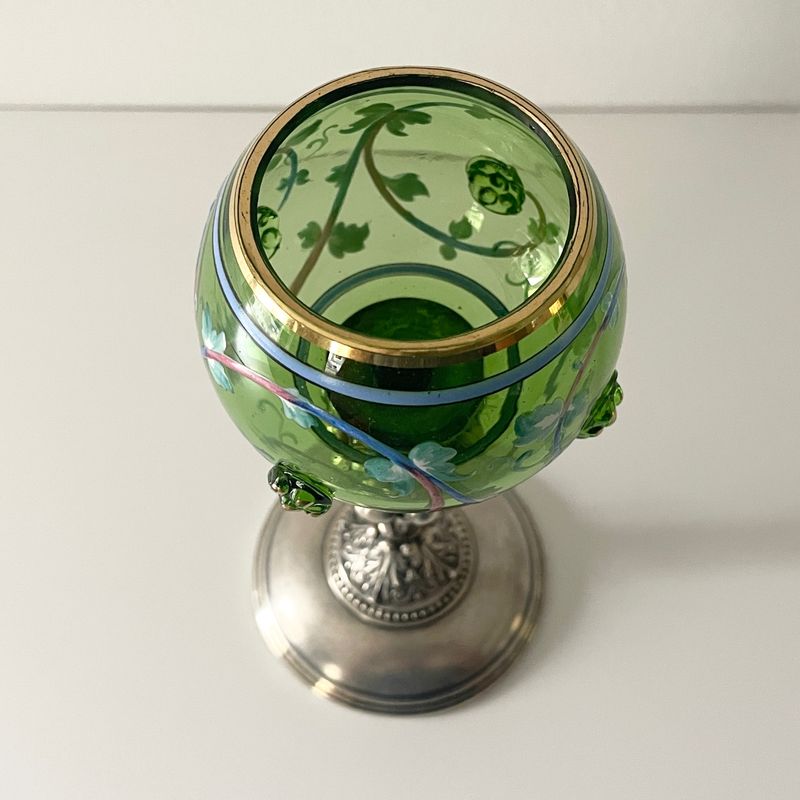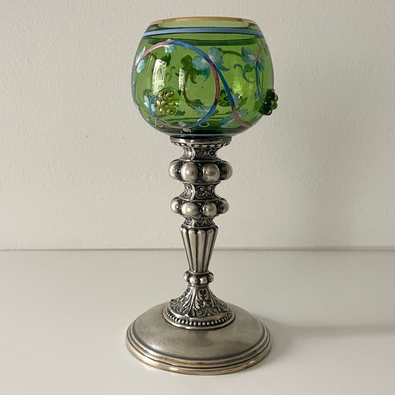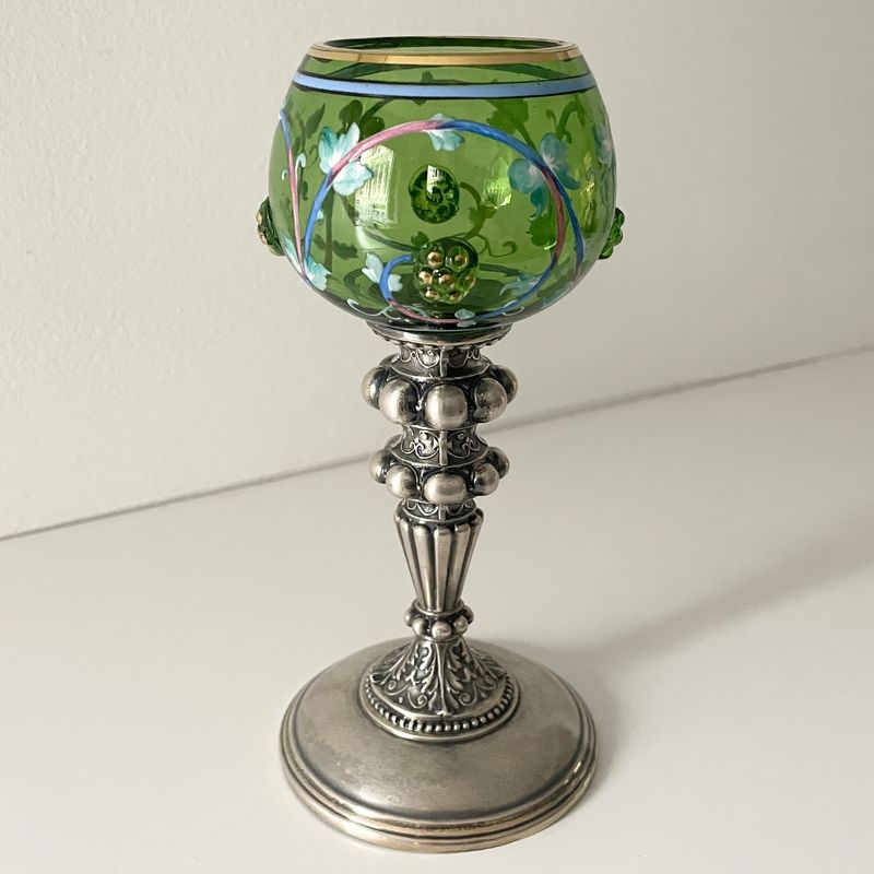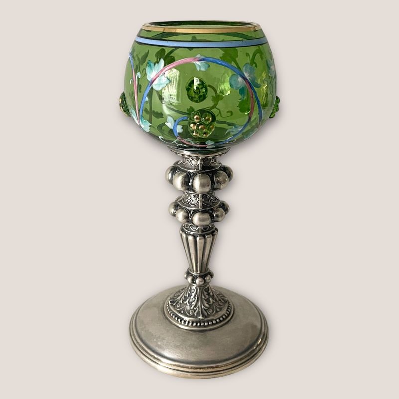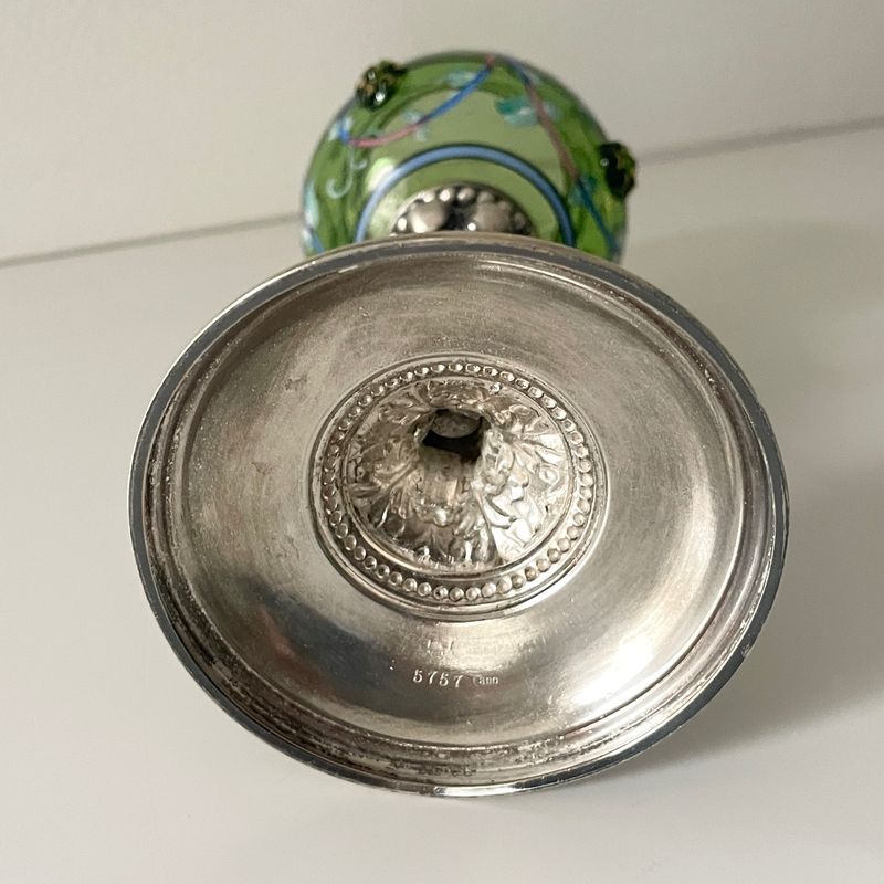 German. Silver and green glass cup. Very Decorative and excellent condition. 17 cm high; 194 grams. Inv: G2686