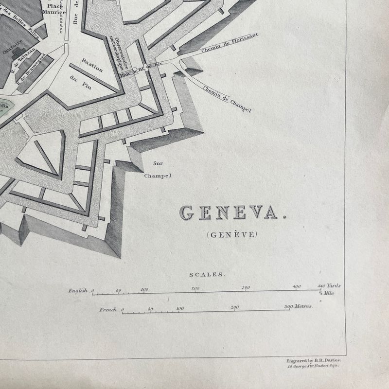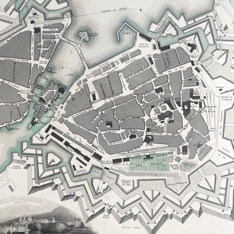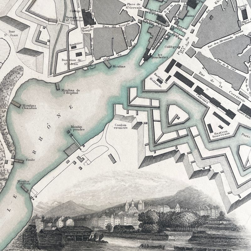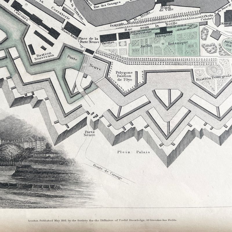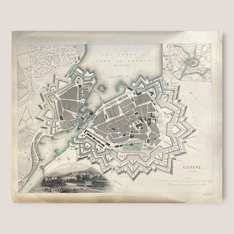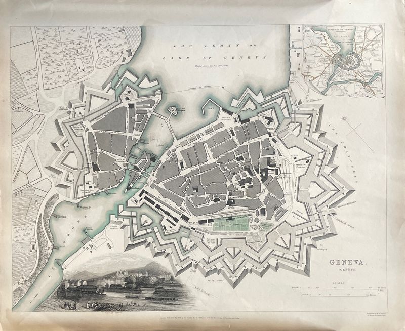 19th Century plan of Geneva with city fortifications, prior to their demolition. Printed in London in 1841. 41x34 cm. Inv: G26138
