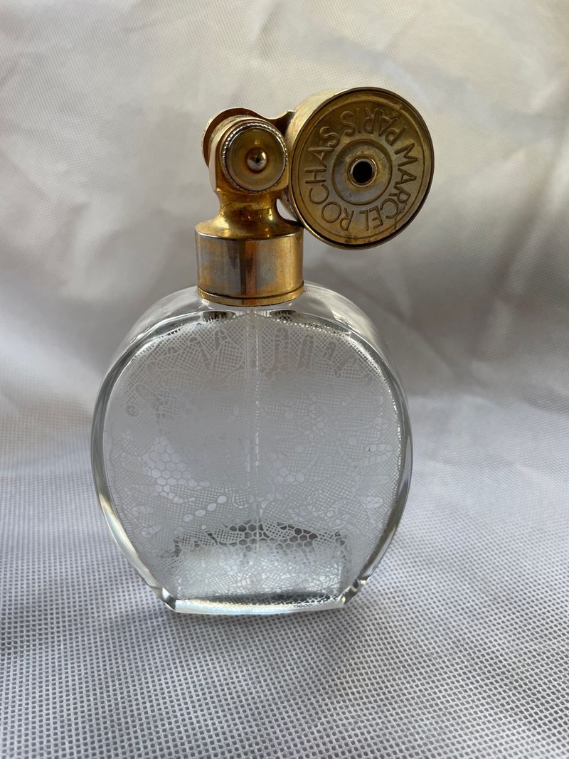 Rare flacon atomiseur de parfum Marcel Rochas pour femme des années 1940. Estampillé Baccarat France dans le fond. Hauteur de 12,5 cm avec le vaporisateur.