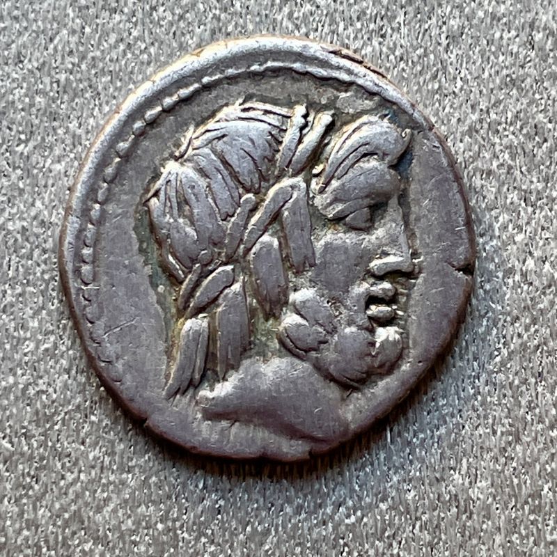 J.-C. Denier. Tête laurée de Jupiter à droite / M VOLTEI M F, Temple de Jupiter Capitolin : façade tétrastyle, trois marches, et foudre au fronton.