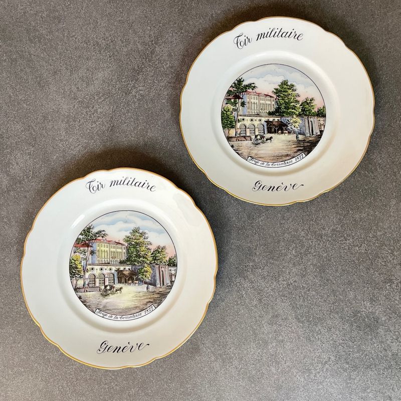 Genève, Paire de plaques de récompense pour le tir militaire de 1932. Représentant la vue de la Corraterie de Genève en 1827. Fabriquées par Langenthal en 1931. Parfait état, trous de suspension percés en usine au dos. 24 cm de diamètre. Inv : 6000D253N49