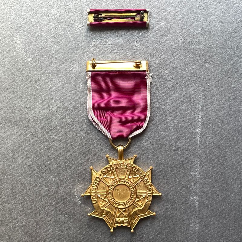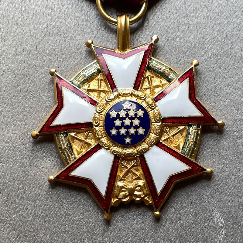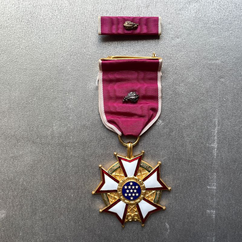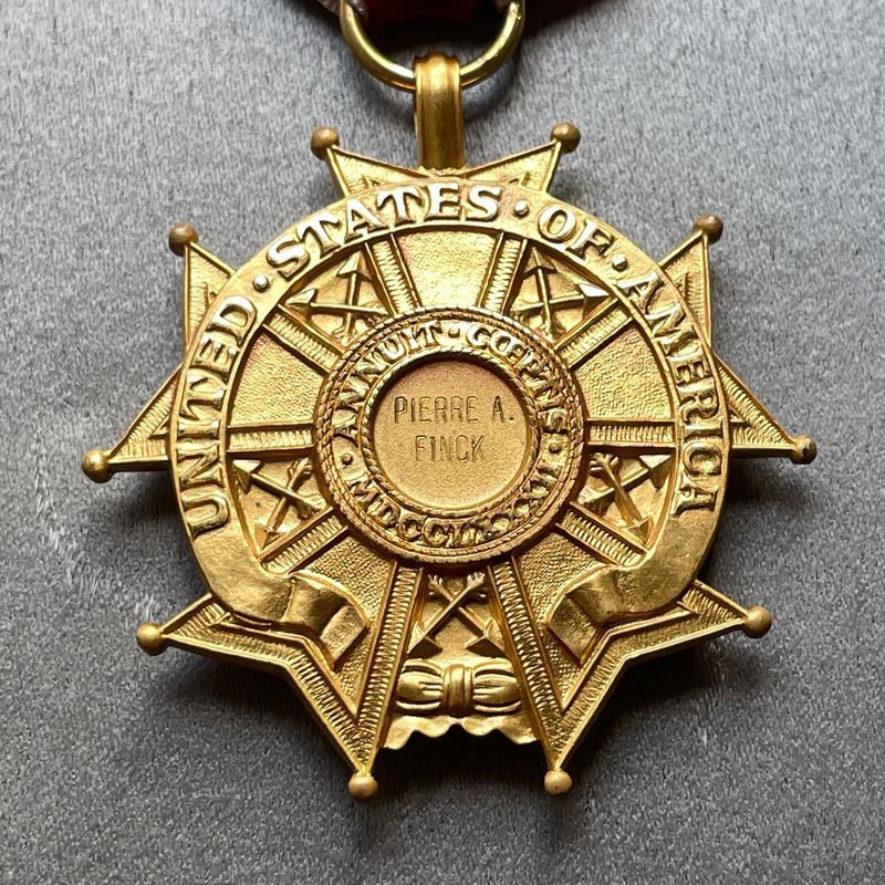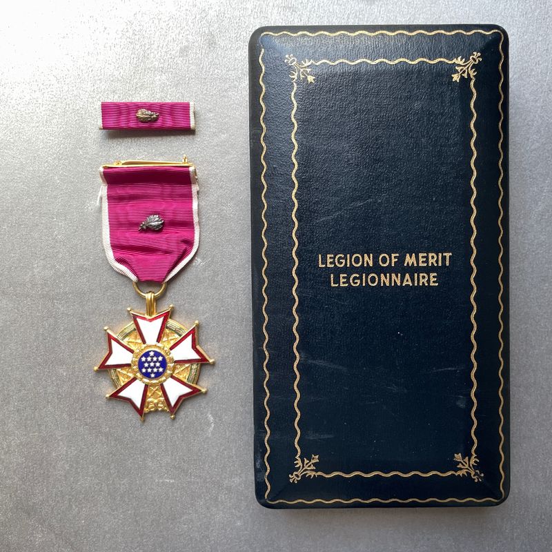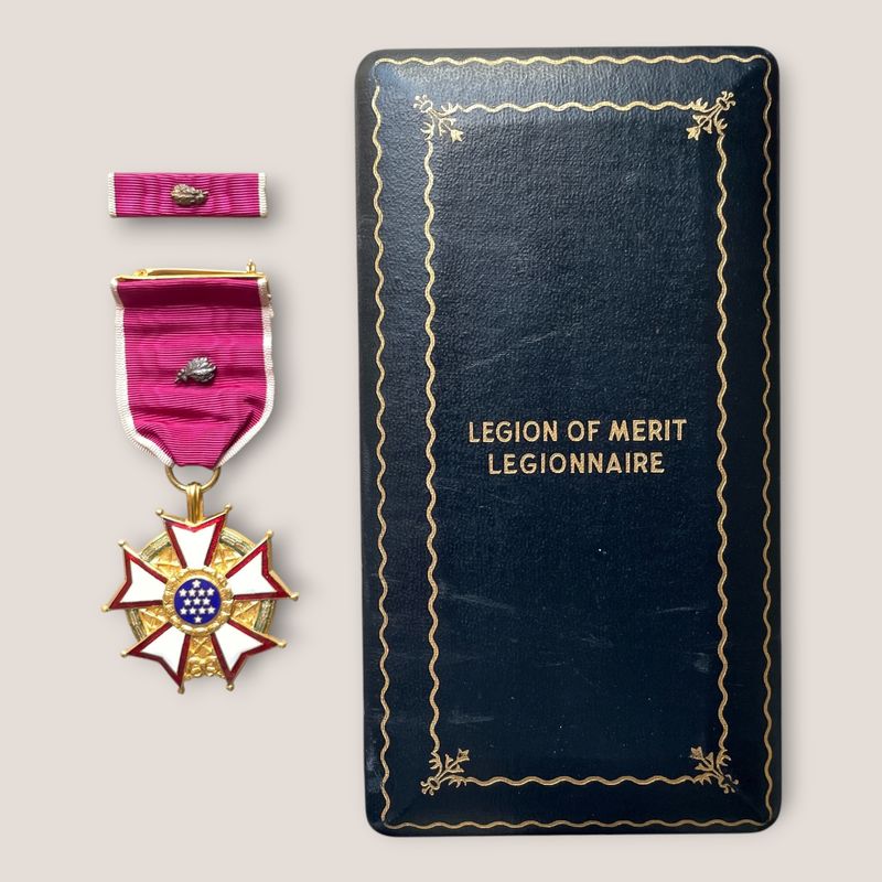 Nous vendons un exemplaire original de la Légion du Mérite, degré légionnaire, présenté dans son étui d'origine et officiellement gravé au nom du colonel Pierre A. Finck, M.D.