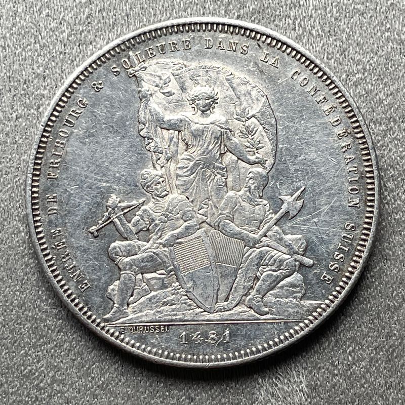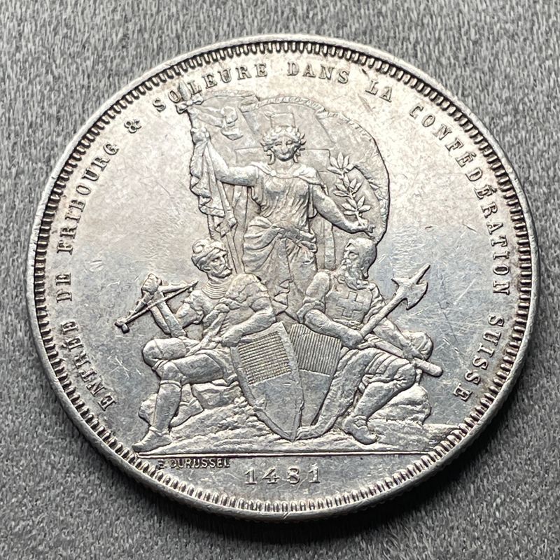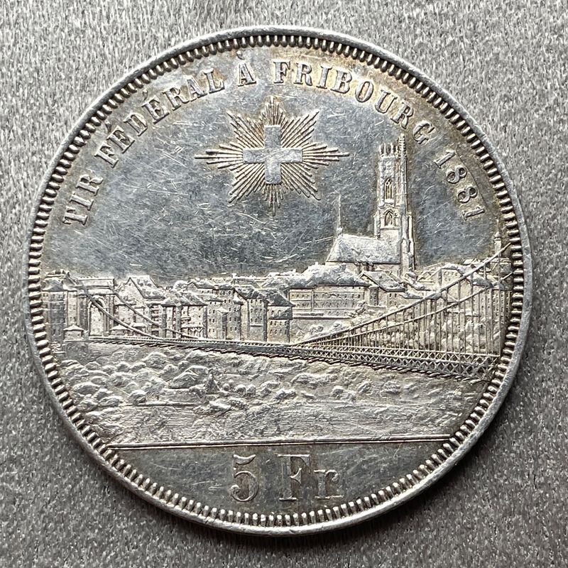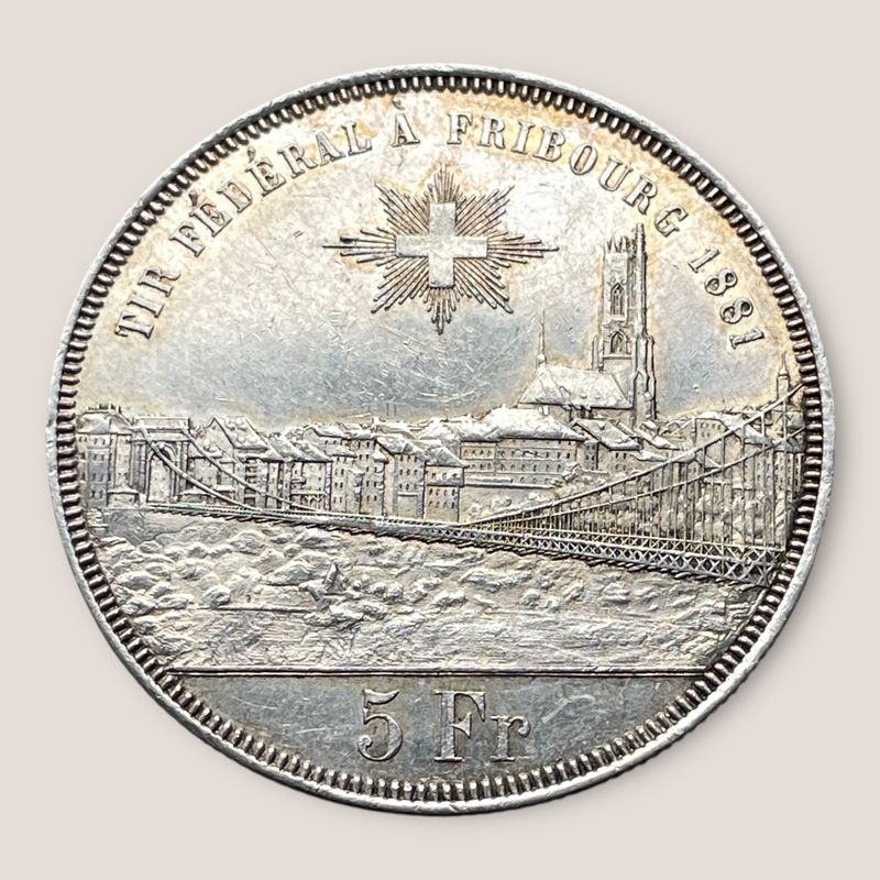Suisse, Fribourg, 5 Francs, Fête fédérale de tir 1881 Belle pièce avec des traces d'éclat d'origine. 25.02 grammes HMZ 2-1343m Inv:G2583