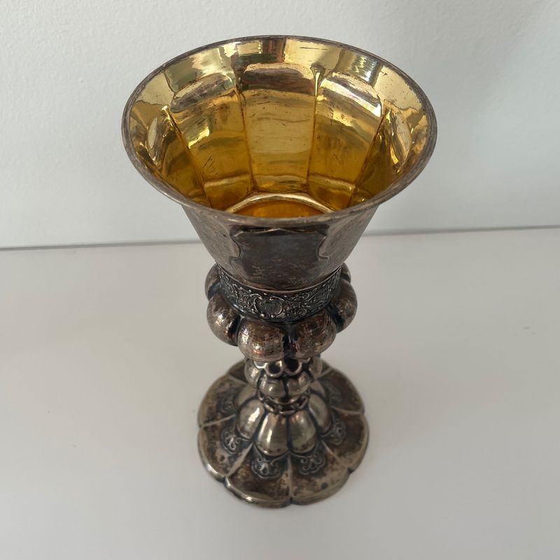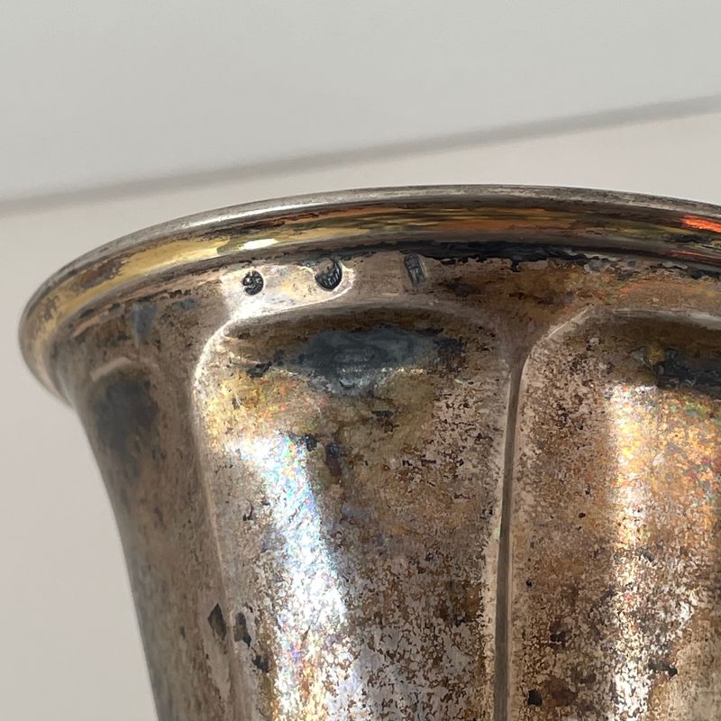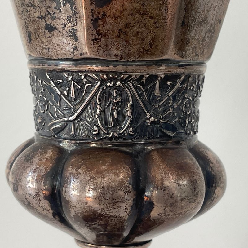 Coupe de tir en argent de la Fête fédérale de tir de Bâle 1844. Il s'agit de la première coupe officielle de la Fête fédérale de tir en Suisse. Par Dreyfus. Excellent état, le seul défaut est qu'une plaque a été soudée sur le dessus de la gravure pour la couvrir, elle peut probablement être enlevée. 214,2 grammes ; 19 cm de haut Inv : G25103