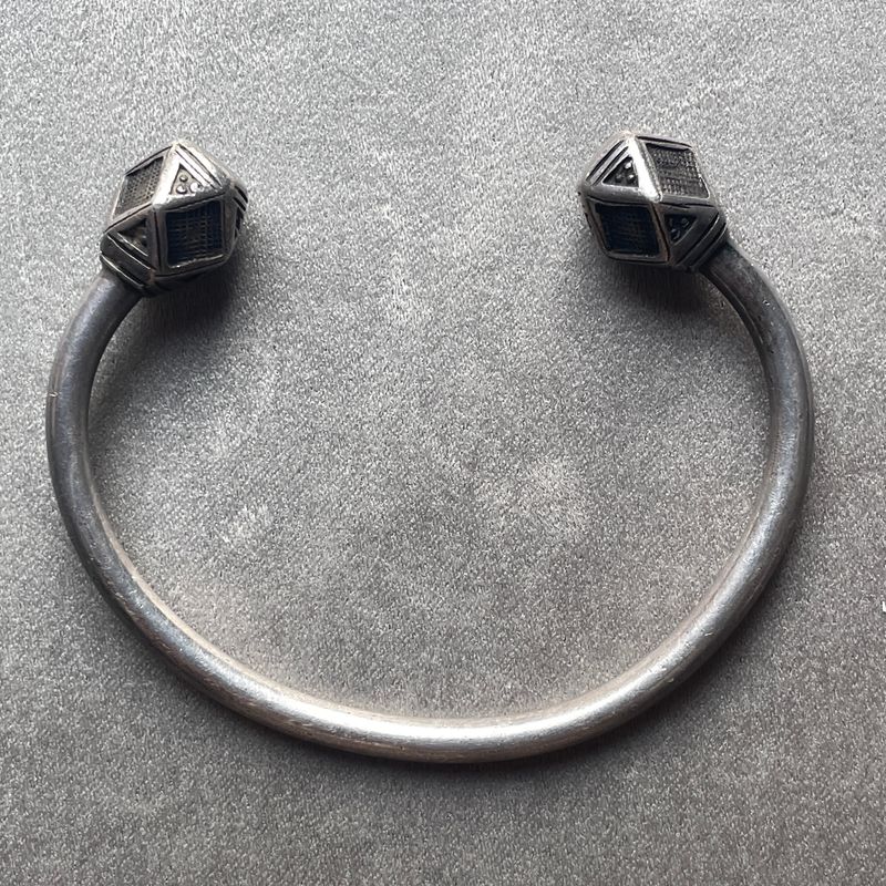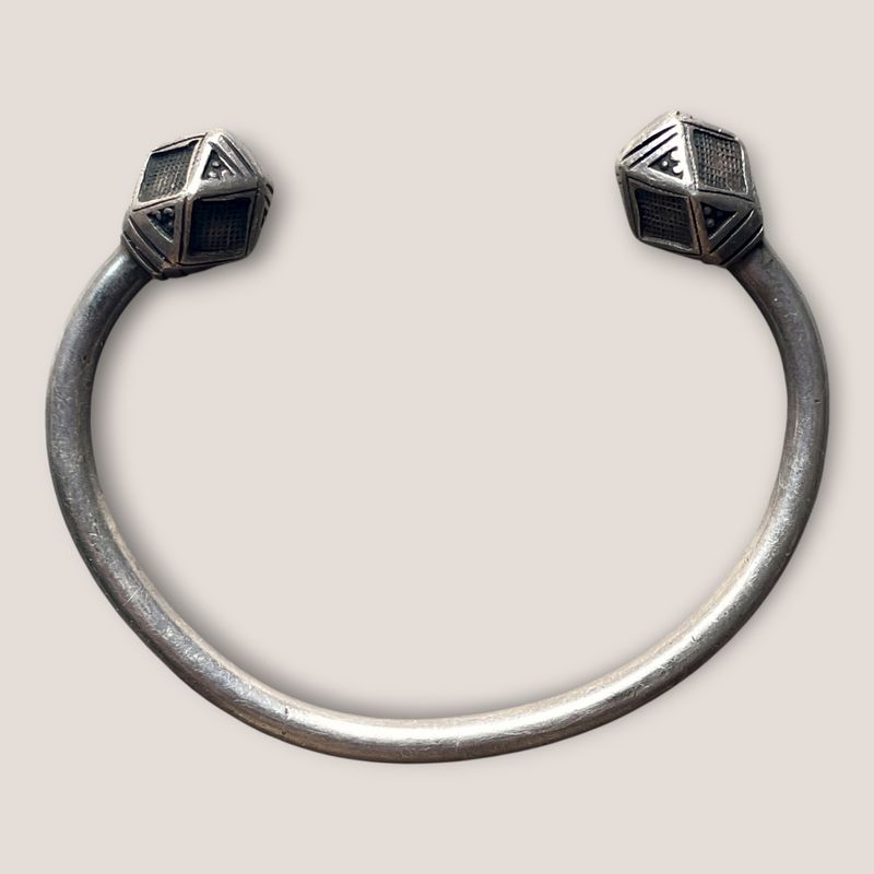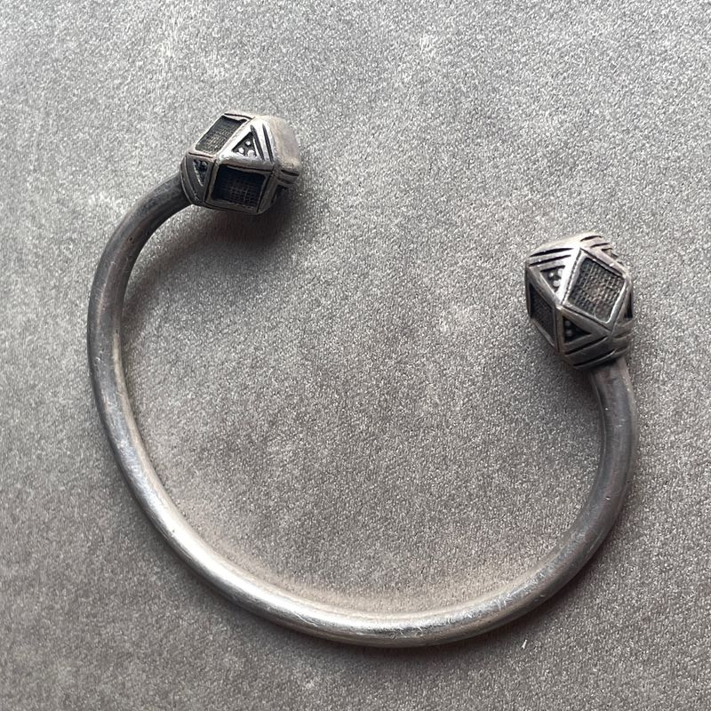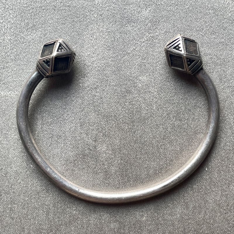 Manchette ou bracelet ethnique touareg vintage en argent massif Milieu du 20ème siècle 37.58 grammes Environ 70 mm de diamètre, mais peut être facilement plié et modifié. Inv : G25127