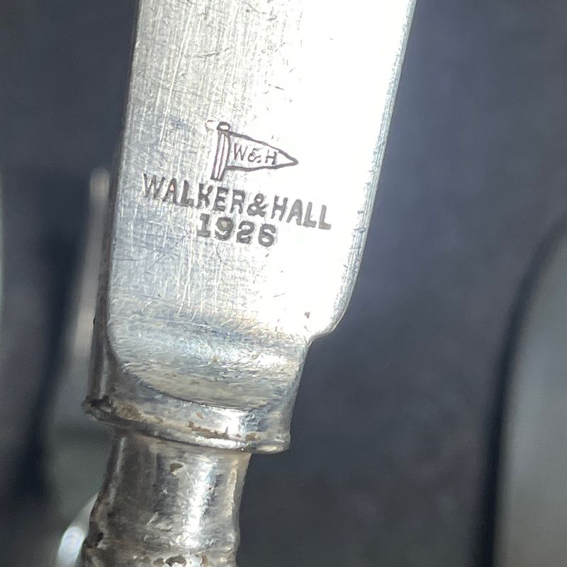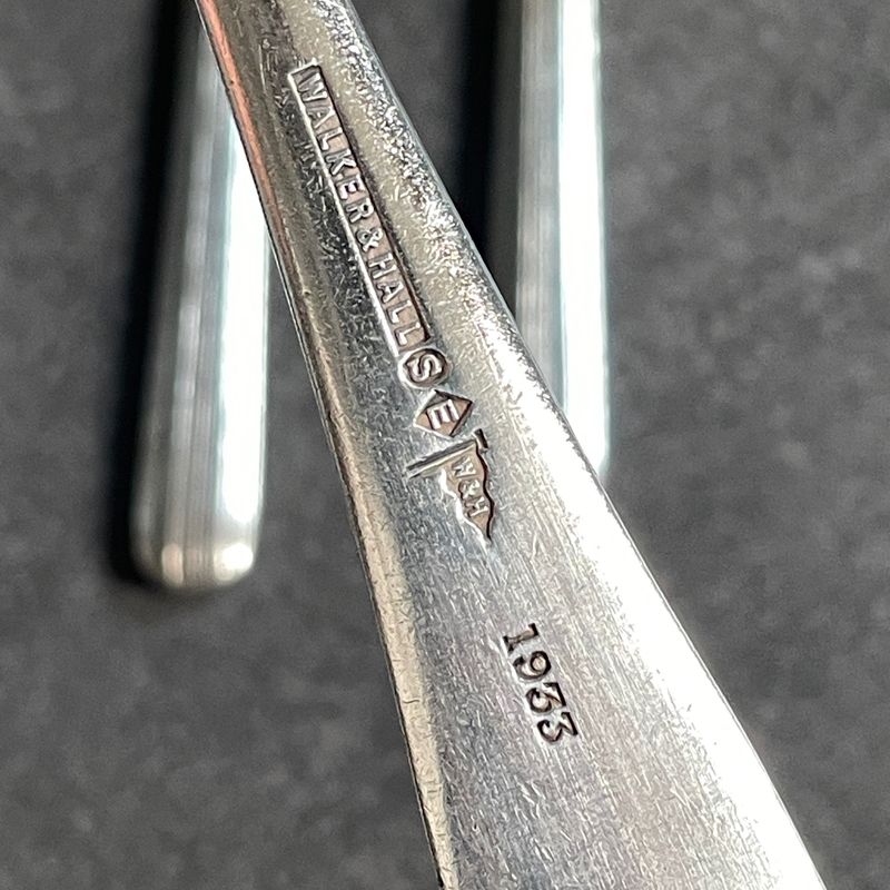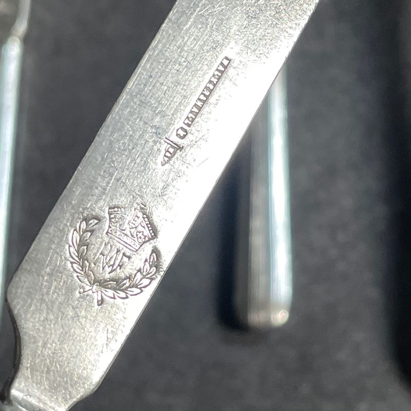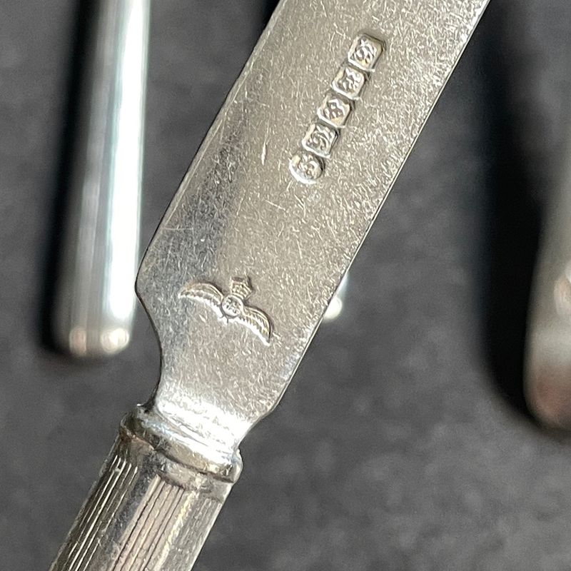 Grande-Bretagne, Royal Air Force, couverts de cantine d'officiers WWII. Magnifique ensemble de couverts, datant des années 1930, utilisés dans la cantine des officiers. Total de 23 pièces. 6 fourchettes, 6 couteaux à poisson, 4 petites fourchettes, 5 petits couteaux, 2 grandes cuillères. Poids total 1542 grammes Inv : G25157