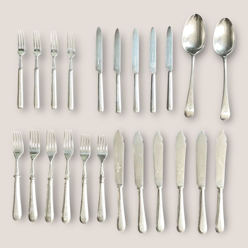 Total de 23 pièces. 6 fourchettes, 6 couteaux à poisson, 4 petites fourchettes, 5 petits couteaux, 2 grandes cuillères.