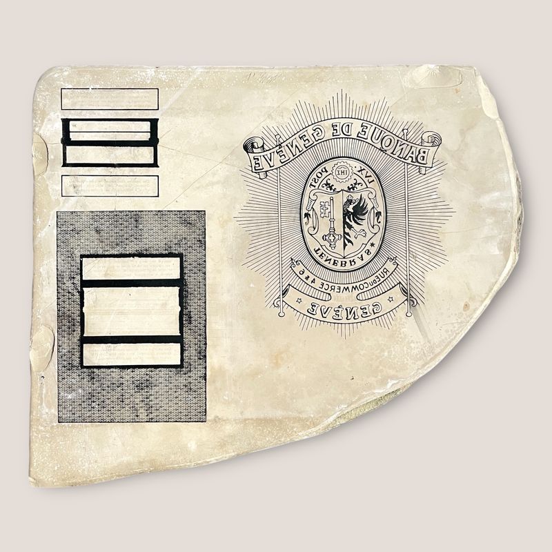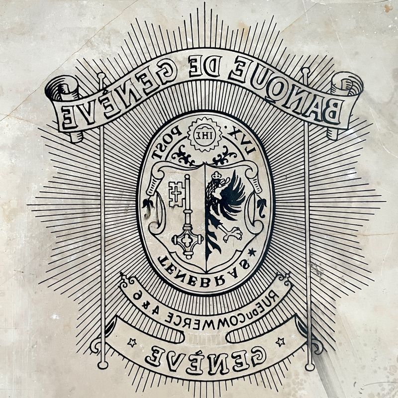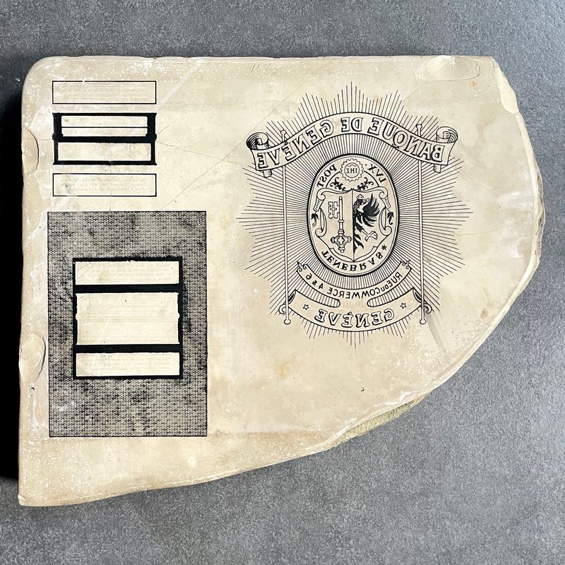 Rare lithographic stone for printing, circa 1900, with the logo of the Bank of Geneva.