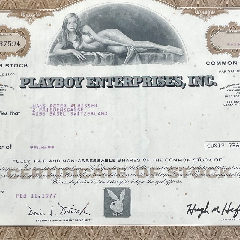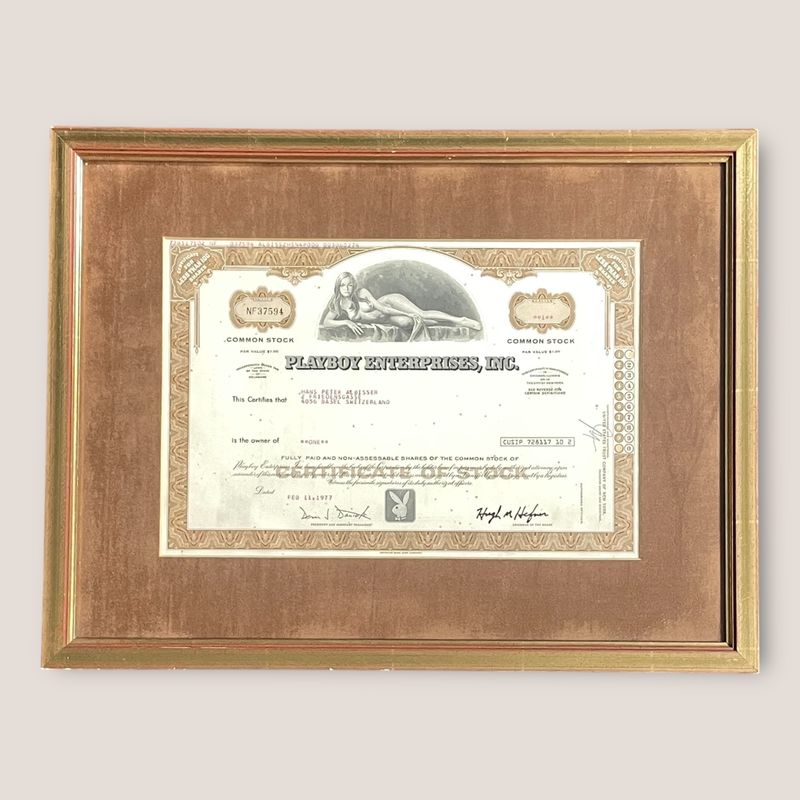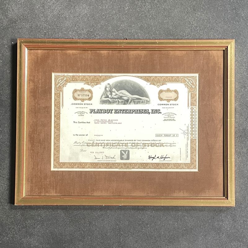 Beautiful Framed Playboy Common Stock share from 1977 in excellent condition.