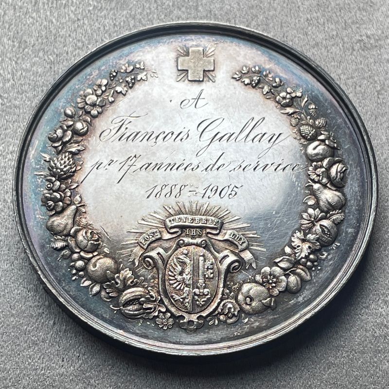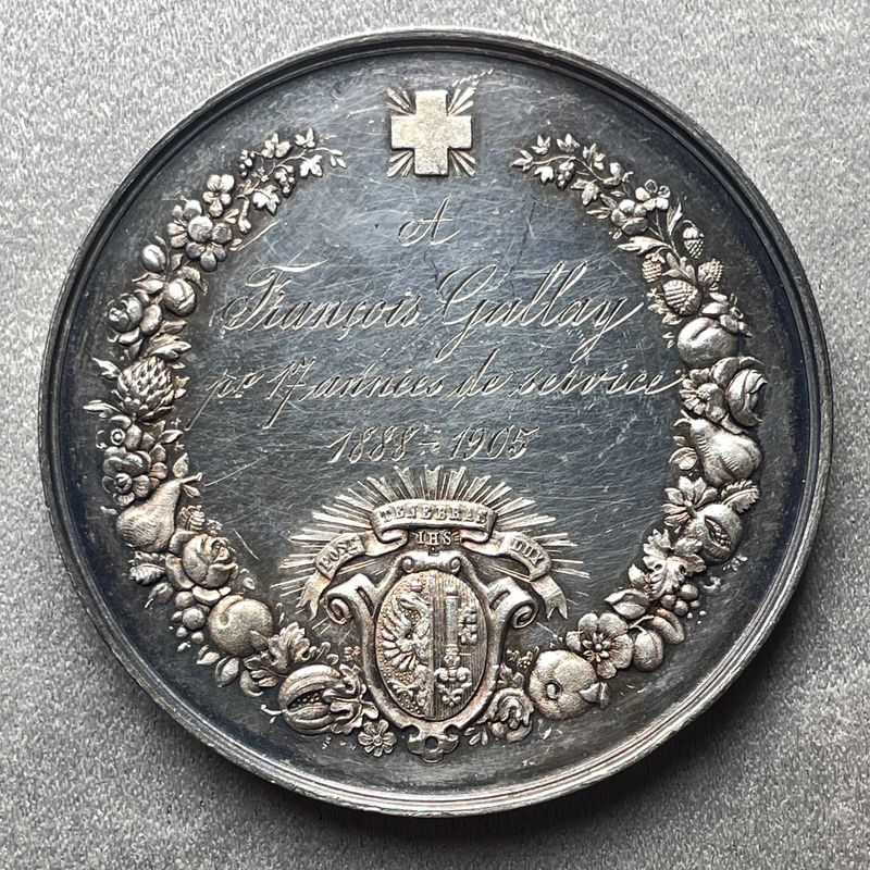 Switzerland, Geneva, Horticulture society Prize, Large Silver medal 1905 Attributed to François Gallay "pour 17 années de service 1888-1905" 67.35 grams; 55 mm INV: G25121