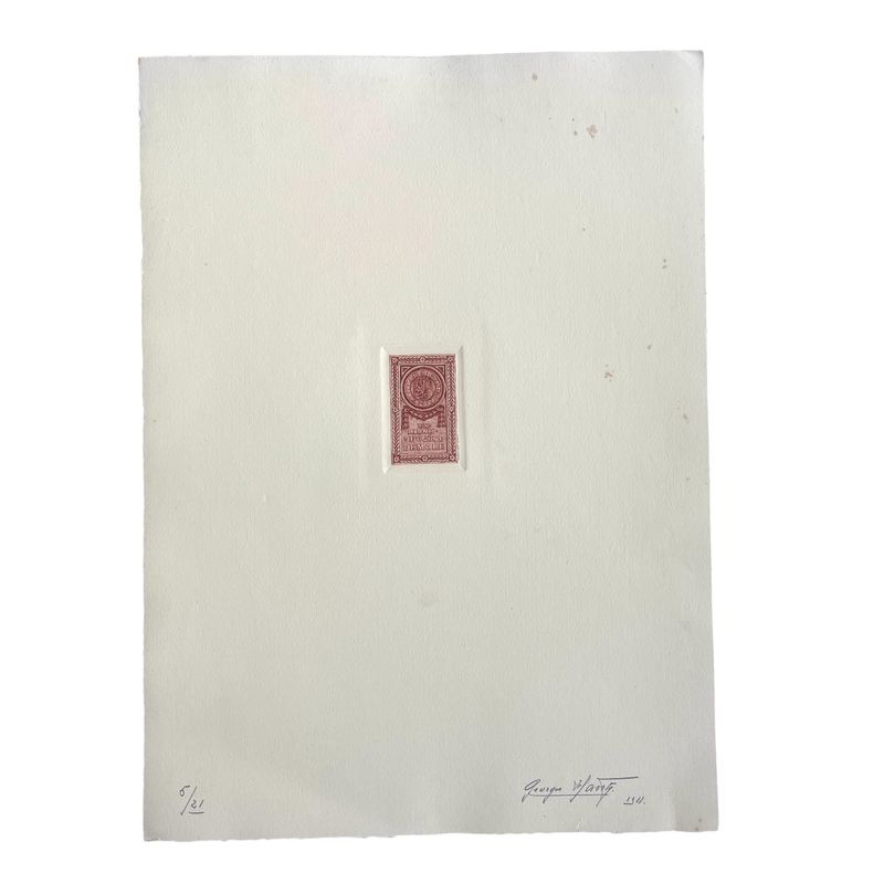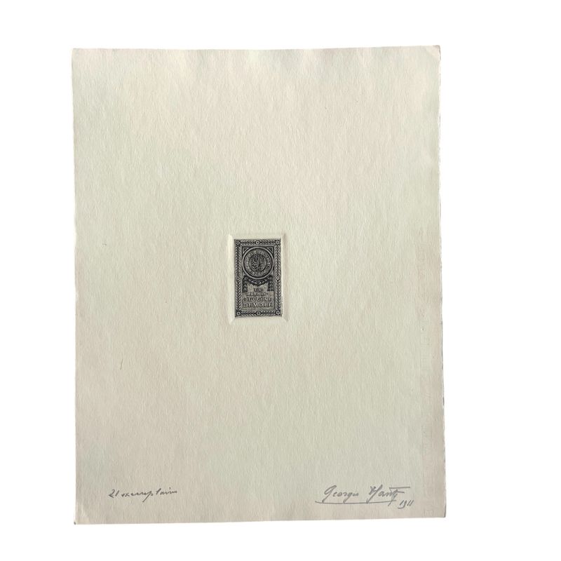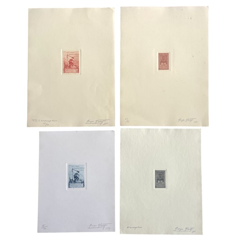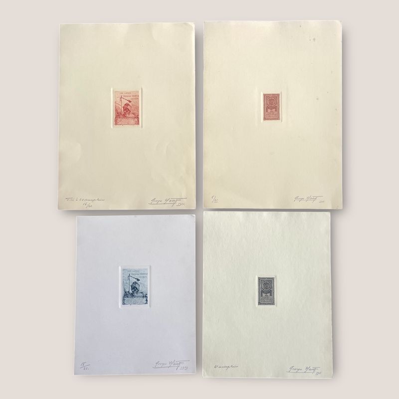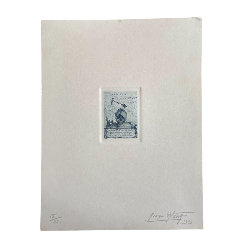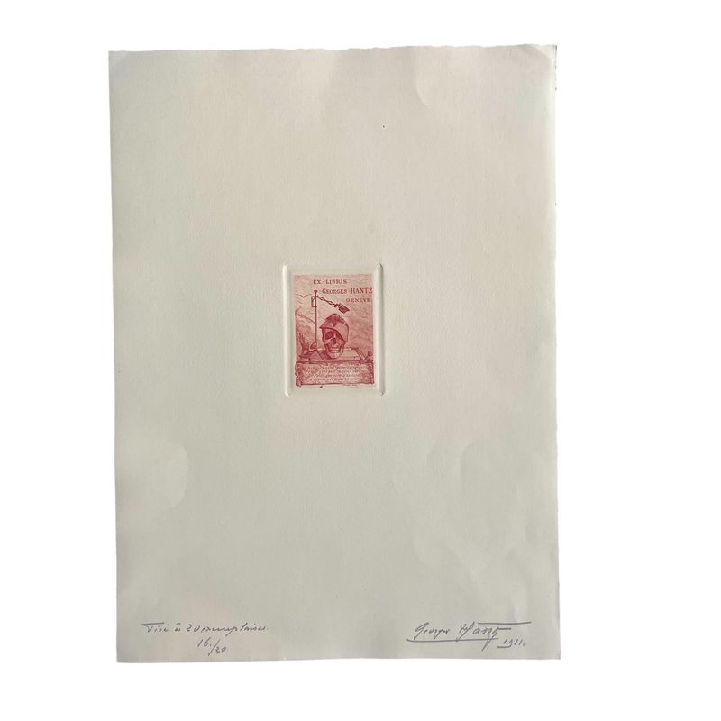 Four Ex Libris signed and numbered specimens of Eugene Demole and Georges Hantz Beautiful specimens, pencil signed and numbered by Georges Hantz, the famous Geneva engraver. 2 sheets are of his personal Ex libris in different colours. 2 sheets are the ex libris of Eugene Demole, the famous Geneva numismatist and the author of Histoire Monetaire de Geneve. Inv: G25146