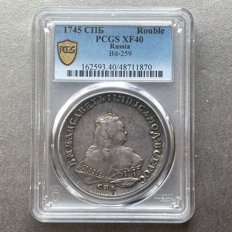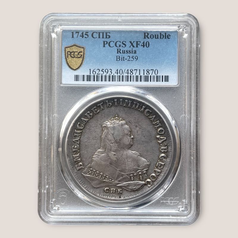 Russian Empire, Elisabeth I (1741-1762) Rouble 1745 SPB. PCGS XF40. Nice problem free coin with a great eye appeal for the grade and an old collection patina. Mintage 427107. Bitkin 259; Conros 64/9 Inv: G2627