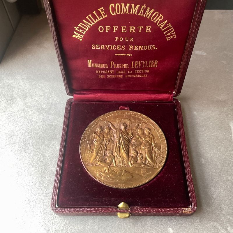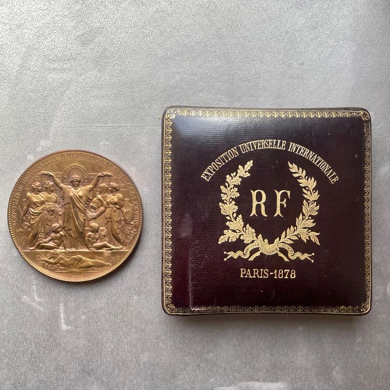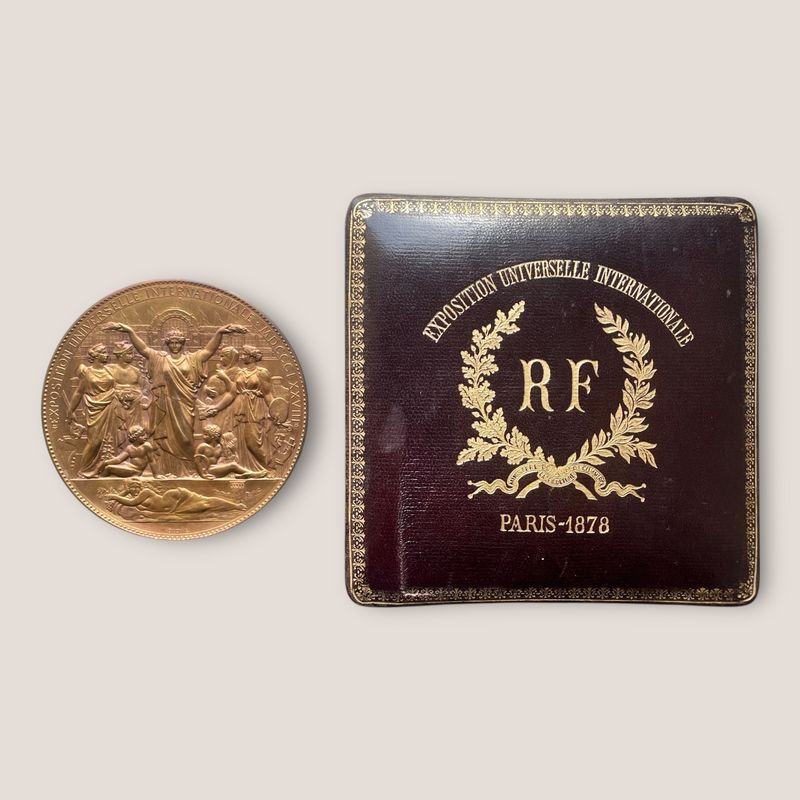 France. Universal Exposition of 1878. Large gilt copper table medal by Oudine in its original case of issue.