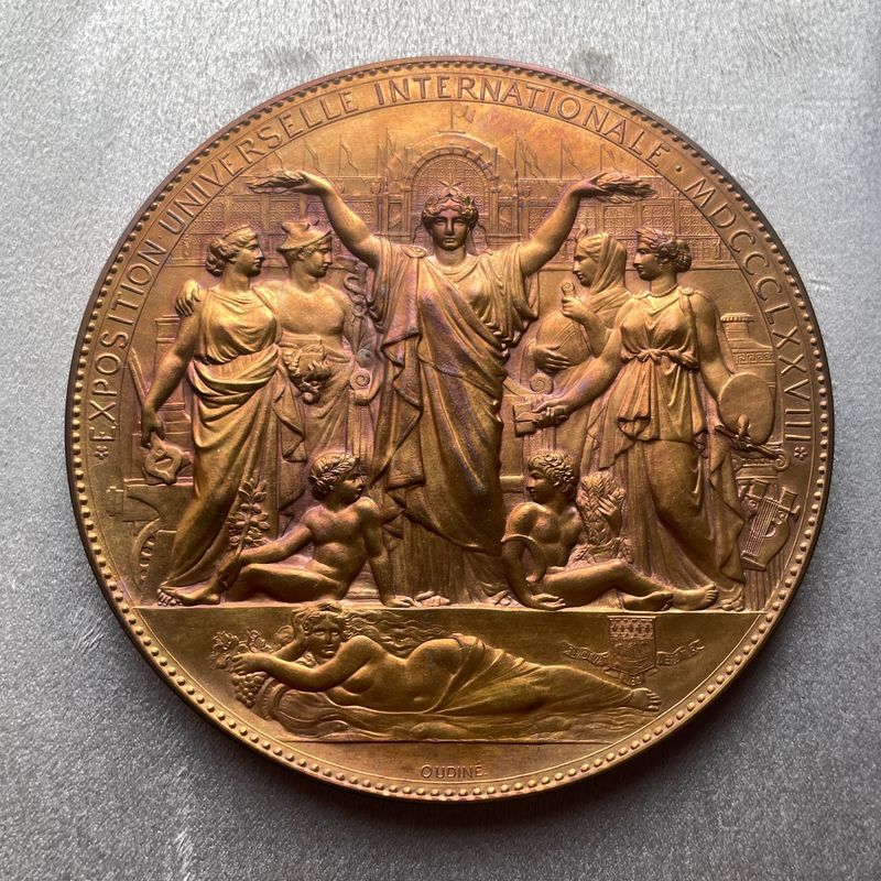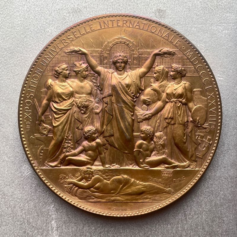 France. Universal Exposition of 1878. Large gilt copper table medal by Oudine in its original case of issue. Rare. 302.3 grams; 86.4 mm. Uncirculated Inv: G2640