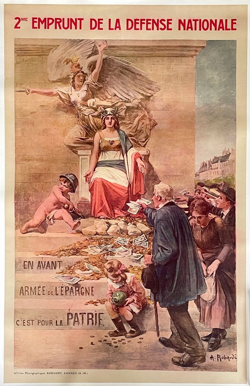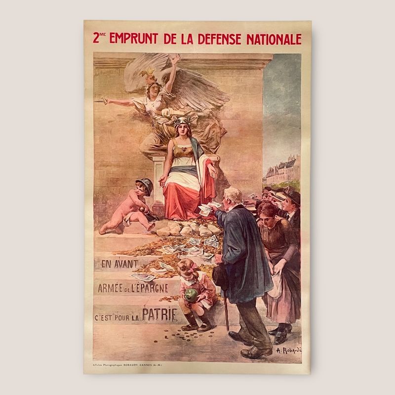 Rare Antique Poster 2e Emprunt de La Défense national Printed 1916 By Alcide Robaudi One of the most famous French poster of the First World War and in wonderful condition. Linen backed. 75x117 cm (poster) ; 80x122 cm (canvas) Inv: G2653