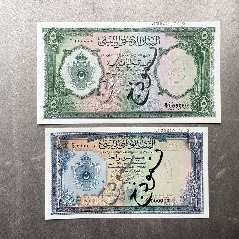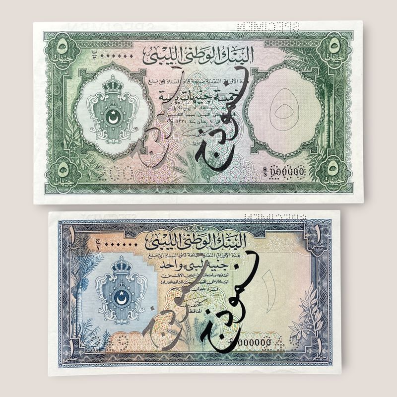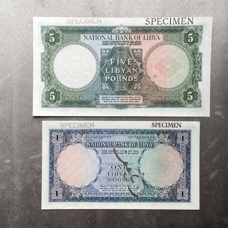 Libya 1 and 5 Pounds 1955 Specimen Banknotes. King Idris I. Rare. Uncirculated. Overprinted SPECIMEN in Arabic in black and once in English on the reverse, perforated SPECIMEN in Arabic and twice 200 on the 5 pounds and 249 on the 1 Pound. Inv: G26141