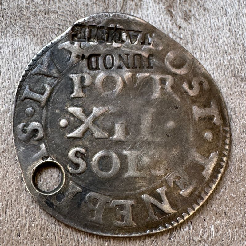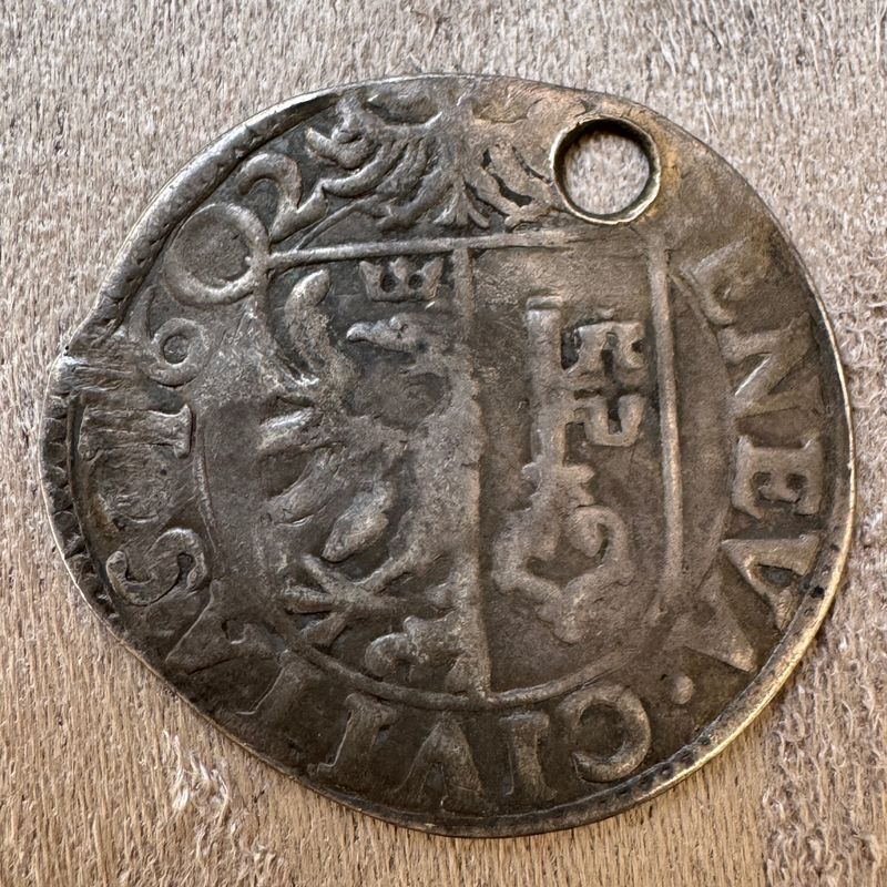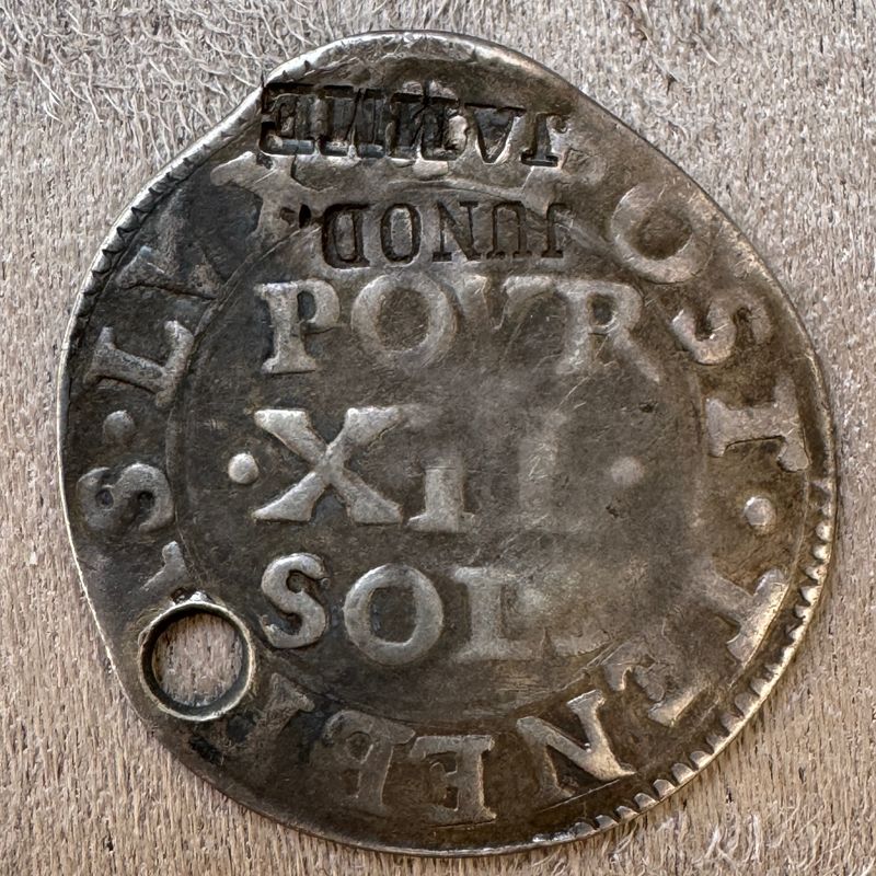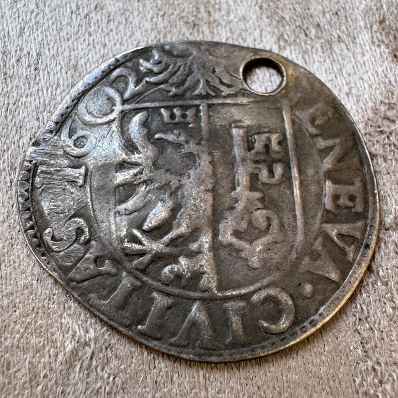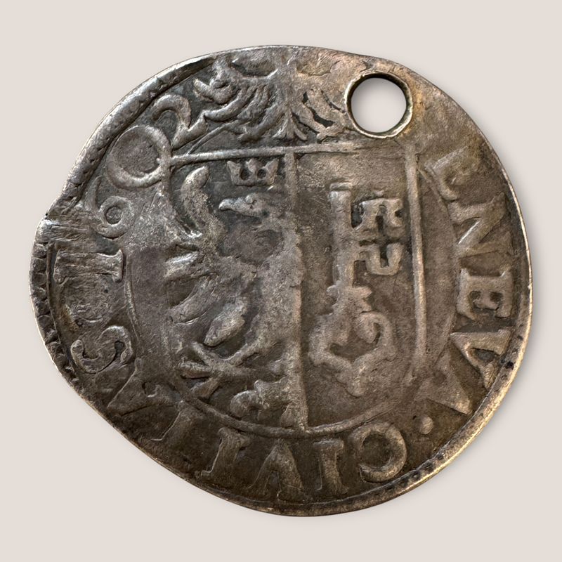 Geneva. 12 Sols 1602. An iconic coin, struck during the ear of the escalade. Pierced and stamped, was likely used as a marriage token by the Junod and Jamme families. 3.7 grams Inv: G26145